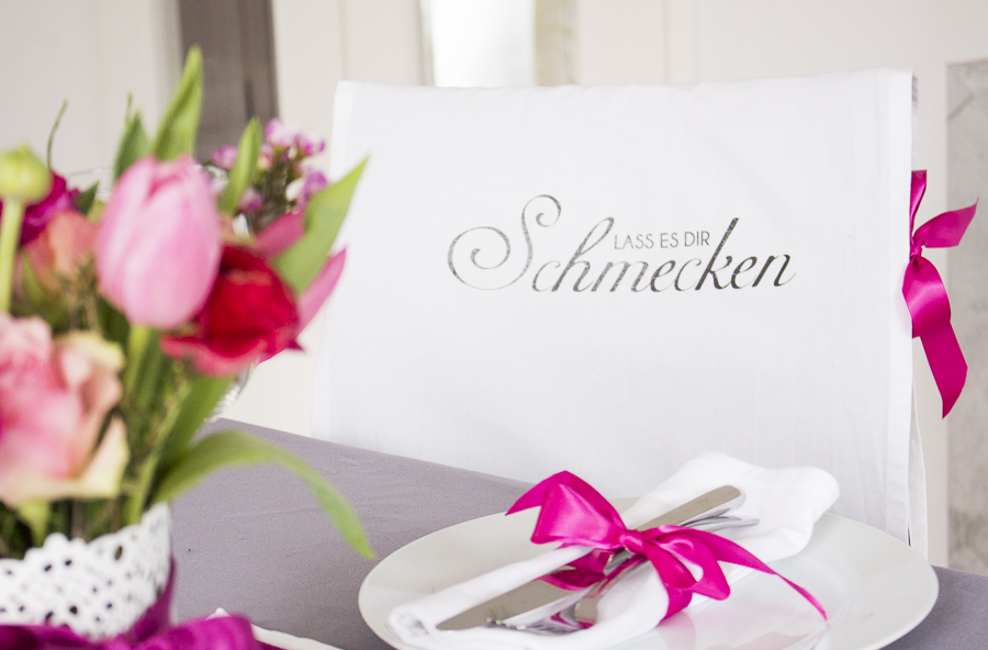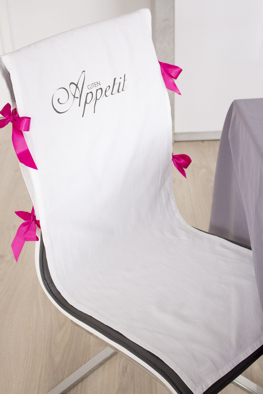„Guten Appetit“ und „Lass es Dir schmecken“ steht auf unseren Tischläufern aus 100% Baumwolle, die für unsere Stühle die perfekten Maße und Eigenschaften hatten, um aus ihnen Stuhlhussen zu zaubern. Wie wir die beiden Sprüche sowie die farbigen Schleifen an- bzw aufgebracht haben, zeigen wir Euch weiter unten Schritt für Schritt in einer Anleitung.