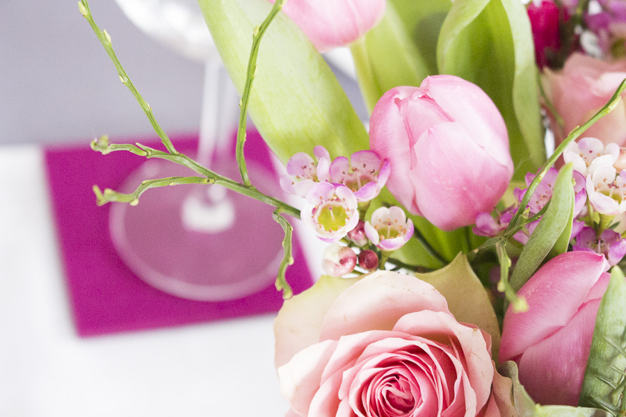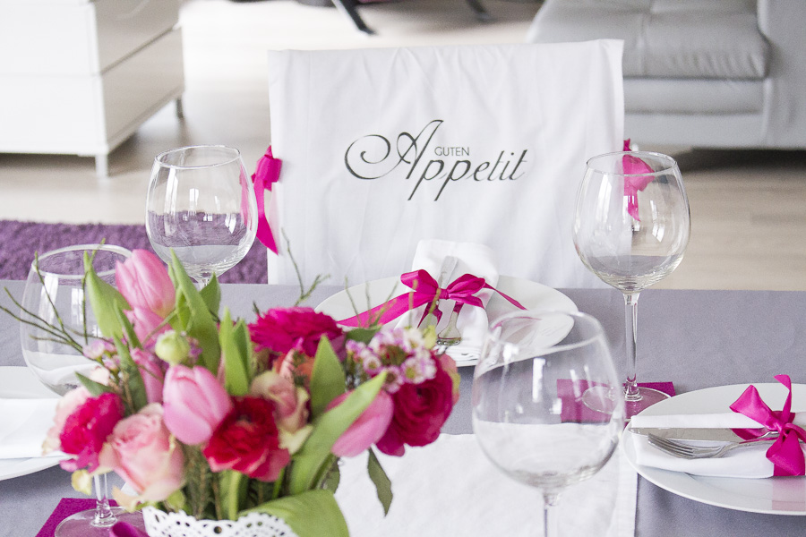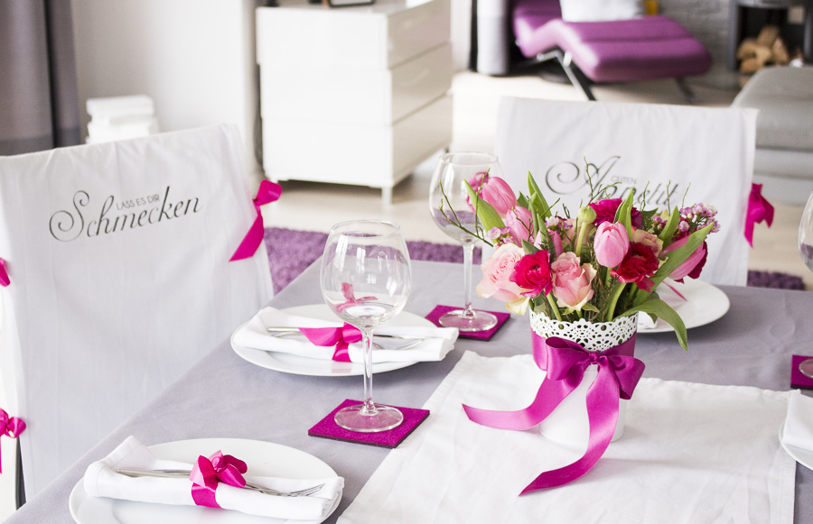 Unser Farbkonzept für das anstehende Dinner sollte „very berry“ sein. Beerentöne also, gern kräftig und fröhlich, um den anstehenden Frühling herbei zu rufen. Kombiniert mit weiß und grau, entsteht ein frisches Farb-Trio, dass Lust auf Frühling und Sommer macht!