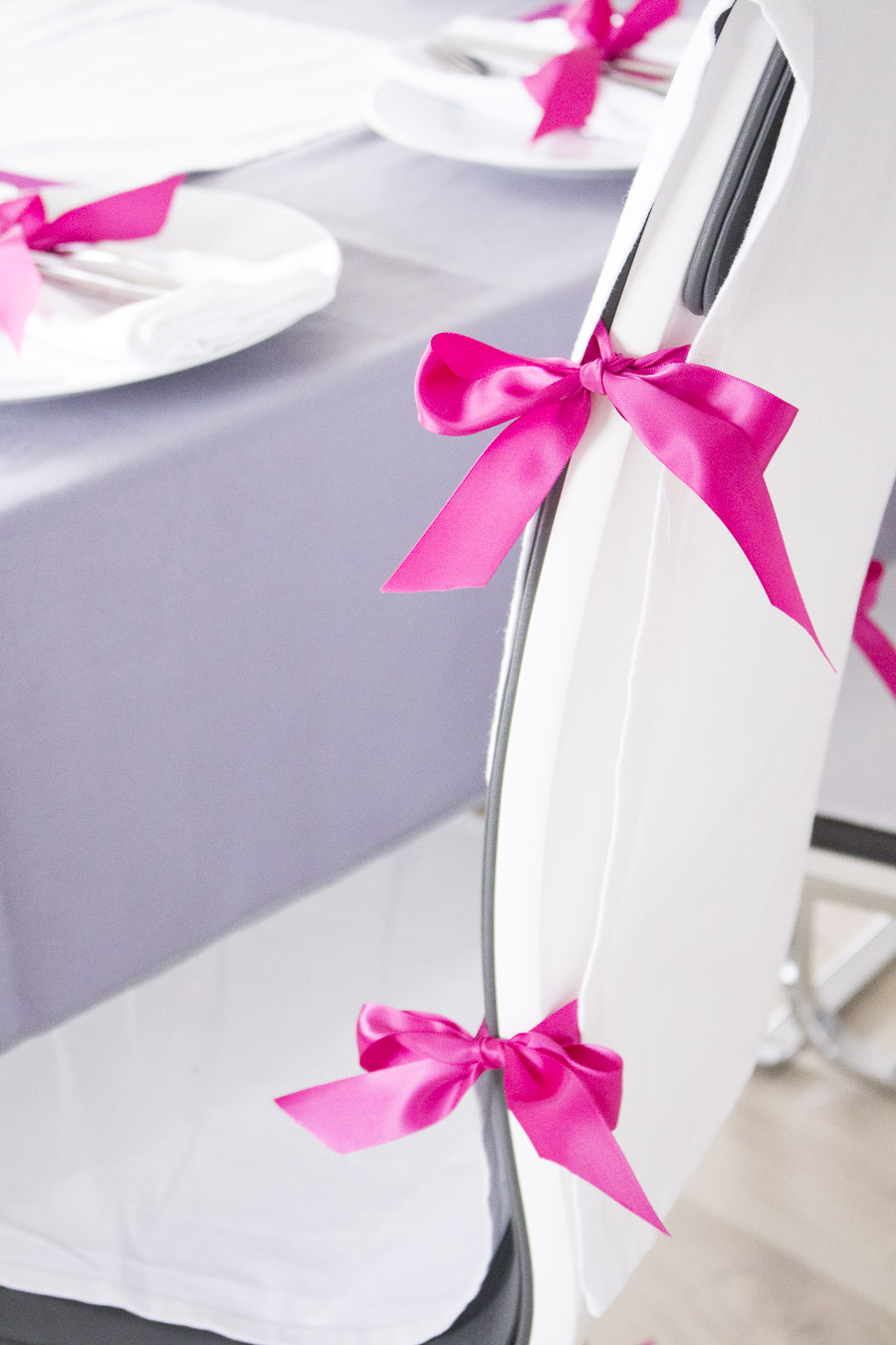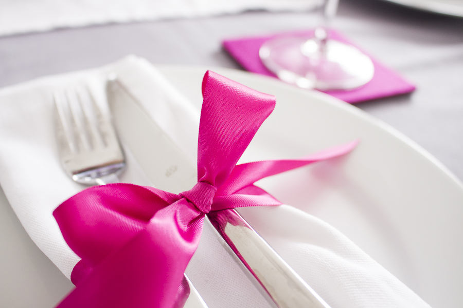 Von dem Schleifenband für die Hussen haben wir übrigens gleich noch ein bisschen mehr eingekauft, um es auch auf dem Tisch als Farbwiederholung auftauchen zu lassen. Dazu haben wir es einfach um weiße Servietten als Schleife gebunden und das Besteck hineingesteckt.
