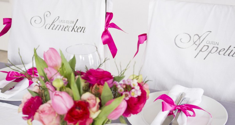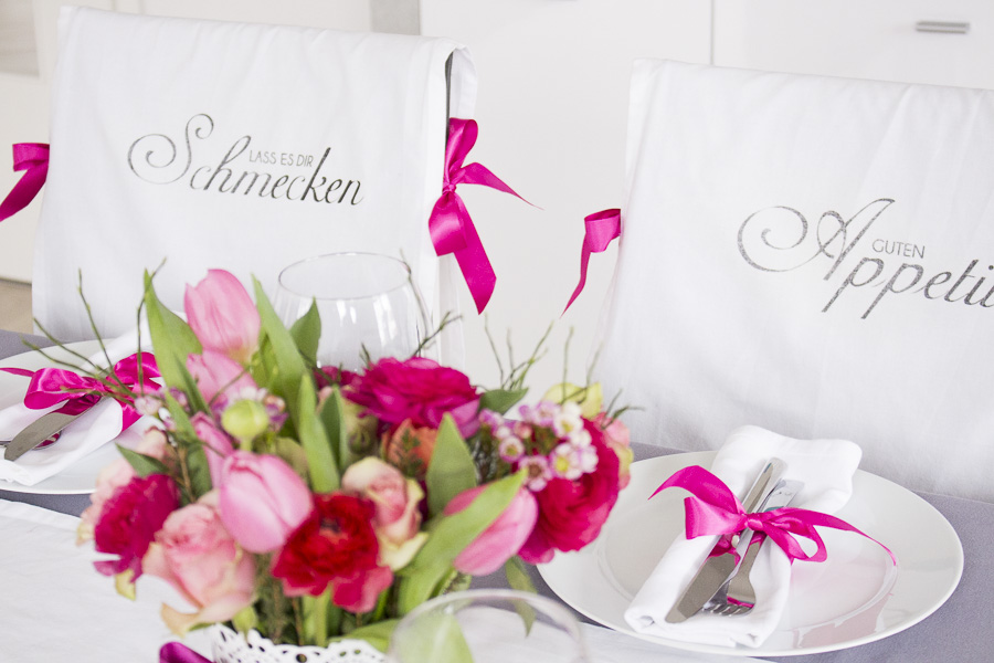 Und das war es auch schon, Eure Stuhlhussen sind fertig! Nun braucht Ihr sie nur noch an Euren Stühlen festbinden, den Tisch zu decken und Eure Gäste können kommen.