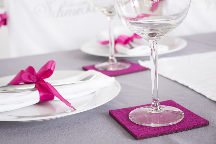 Ganz zufällig war die Auswahl der beerigen Farbtöne für unsere Tischdeko übrigens nicht; bei der Suche nach Tischläufern sind wir im DEPOT Online-Shop nämlich noch an Glasuntersetzern aus Filz in selbigen Farbtönen vorbei gekommen. Auf der einen Seite ein kräftiger Beerenton, auf der anderen ein etwas dunklerer Beerenton. Perfekt, Entscheidung für Farbkonzept gefallen! Jetzt noch ein paar hübsche Frühlingsblumen in kräftigen Magenta-Tönen dazu und dann passt alles schön zusammen.