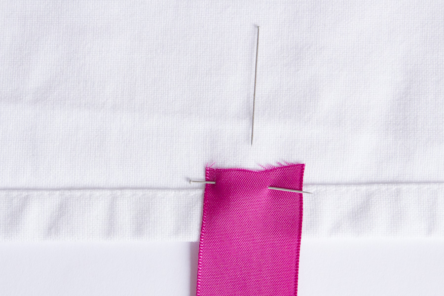 Step 4: Bringt Eure Schleifenband-Abschnitte an den markierten Stellen am Saum des Läufers (Rückseite!) mit Stecknadeln an. Die Markierungsnadeln könnt Ihr dann herausziehen, die braucht Ihr nicht mehr.