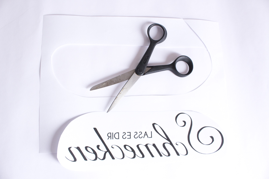 Hinweis: Nein, wir waren weder übermüdet noch angetüdelt beim Designen der Druckvorlage; die Schriftzüge drucken spiegelverkehrt und das soll auch so sein. Falls Ihr Euch Eure eigenen Designs gestalten möchtet (z.B. ganz simpel in Powerpoint), denkt am Schluss auch daran das Design oder den Schriftzug zu spiegeln, bevor Ihr es ausdruckt.