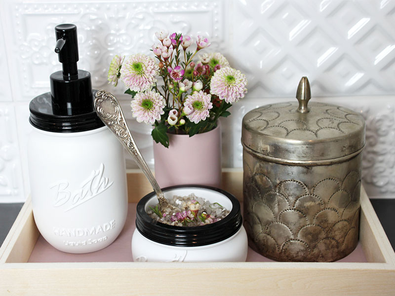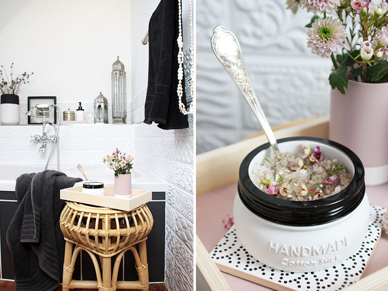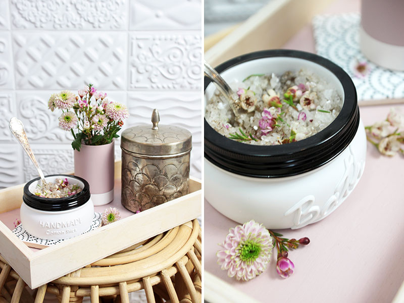 Zusätzlich zu dem Badesalz hab ich dann noch ein paar neue Badaccessoires und Dekoelemente in unserem Bad arrangiert. Unter anderem habe ich einen Zahnputzbecher als kleine Blumenvase umfunktioniert. Beides zusammen dann noch auf einem hübschen Holztablett arrangiert und fertig ist die private Wellnessoase.