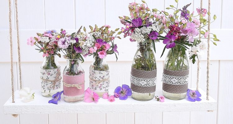 In luftiger Höhe, auf einer kleinen Holzschaukel, präsentieren sich bunt gemischte Wiesenblumensträuße in kleinen Flaschenvasen, die ich mit Stoffresten und Bändern verziert habe. Falls ihr eure Flaschenvasen auch ein wenig aufpeppen wollt, HIER findet ihr die DIY-Anleitung dazu.