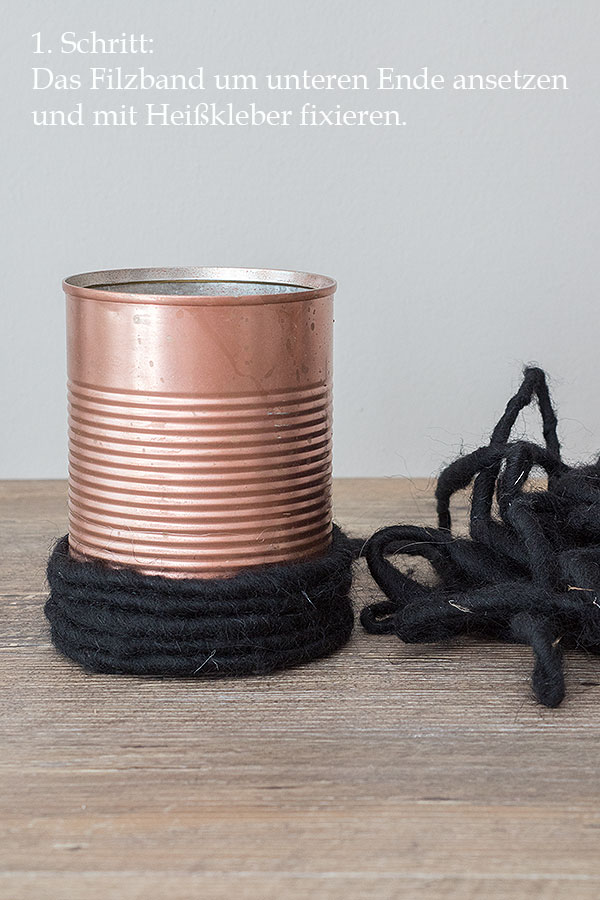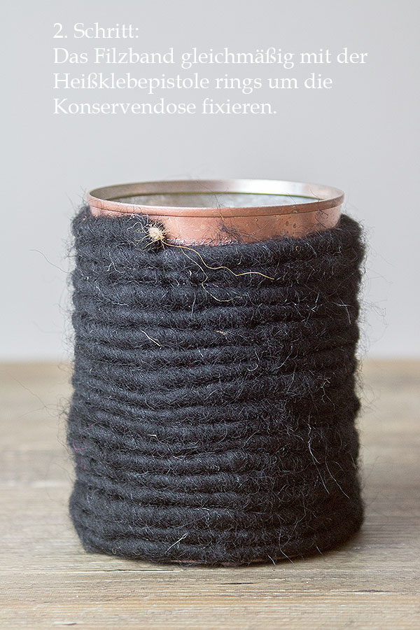 - Nun immer einen dünnen Streifen Heißkleber auf der Konservendose entlangziehen und sofort das Filzband gleichmäßig und schnell festdrücken. Soweit um die Dose wickeln und fixieren, wie man mag.