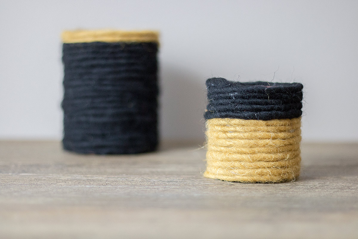 - Die 2. Farbe am Ende der ersten Farbe mit Heißkleber fixieren und genauso verfahren wie mit der 1. Farbe, bis man die Konservendose komplett umhüllt hat.