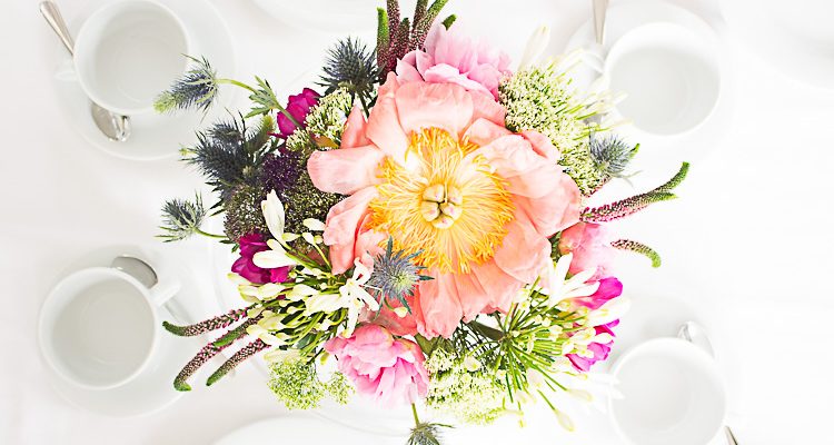 Blumen in Vasen stellen kann jeder. Wenn diese dann aber zwischen uns und unseren Gästen in der Mitte auf der gedeckten Kaffeetafel stehen, haben sie leider einen entscheidenden Nachteil: man sieht sein Gegenüber nicht mehr, weil die Blumen im Weg sind. Kennt Ihr, oder?! Wenn man versucht dran vorbei oder oben drüber zu linsen und Blickkontakt aufzubauen? Anstrengend auf Dauer. Und am Ende werden die Blumen dann vom Tisch genommen und von allen mit einem „Ah, viel besser“ quittiert.