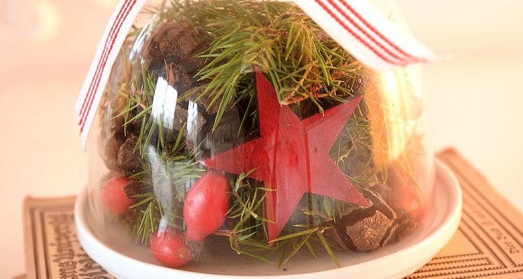 Glasglocke gefüllt mit Naturmaterialien und einem Holzstern