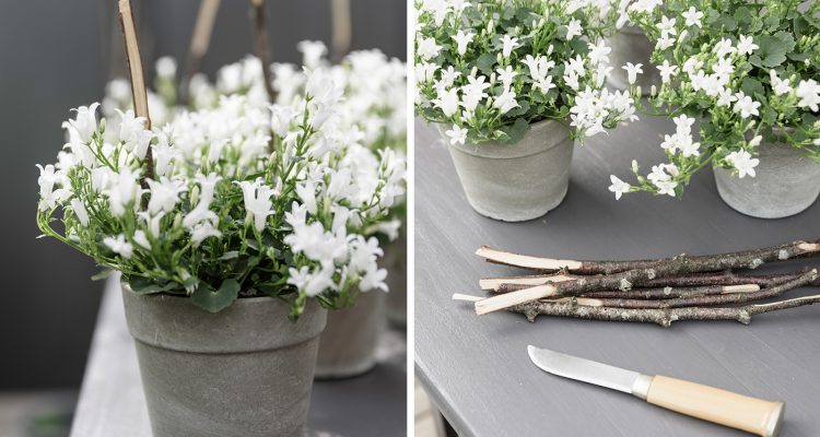 Kaum standen die Blumen auf dem Tisch, schon waren sie von Insekten bevölkert. Es ist schön, wenn man von Bienen Besuch bekommt und ihnen bei der Arbeit zusehen und zuhören kann. Die weißen Glockenblumen stehen in Betonpflanztöpfen von DEPOT. Verziert habe ich die Blumen zusätzlich mit selbst geschnitzten Pflanzstöcken. O.k. ich gebe zu, bei mir gibt es keine Verwechslung, kennt man eine Sorte, kennt man alle :) ! Aber die selbstgemachten Pflanzstöcke sind so dekorativ, dass ich sie ebenso gut in meine einheitlichen Töpfe stecken kann.