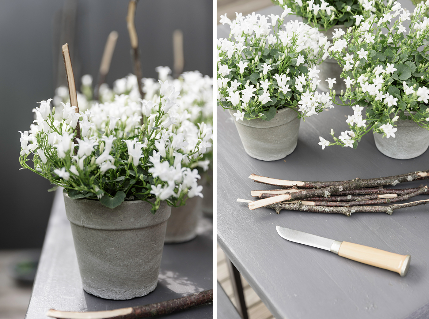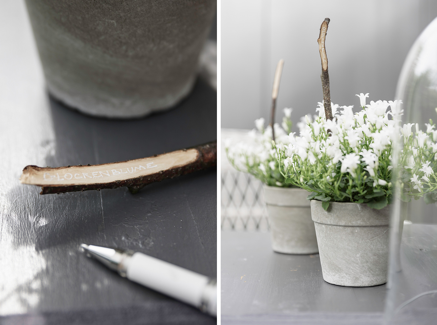 Kaum standen die Blumen auf dem Tisch, schon waren sie von Insekten bevölkert. Es ist schön, wenn man von Bienen Besuch bekommt und ihnen bei der Arbeit zusehen und zuhören kann. Die weißen Glockenblumen stehen in Betonpflanztöpfen von DEPOT. Verziert habe ich die Blumen zusätzlich mit selbst geschnitzten Pflanzstöcken. O.k. ich gebe zu, bei mir gibt es keine Verwechslung, kennt man eine Sorte, kennt man alle :) ! Aber die selbstgemachten Pflanzstöcke sind so dekorativ, dass ich sie ebenso gut in meine einheitlichen Töpfe stecken kann.