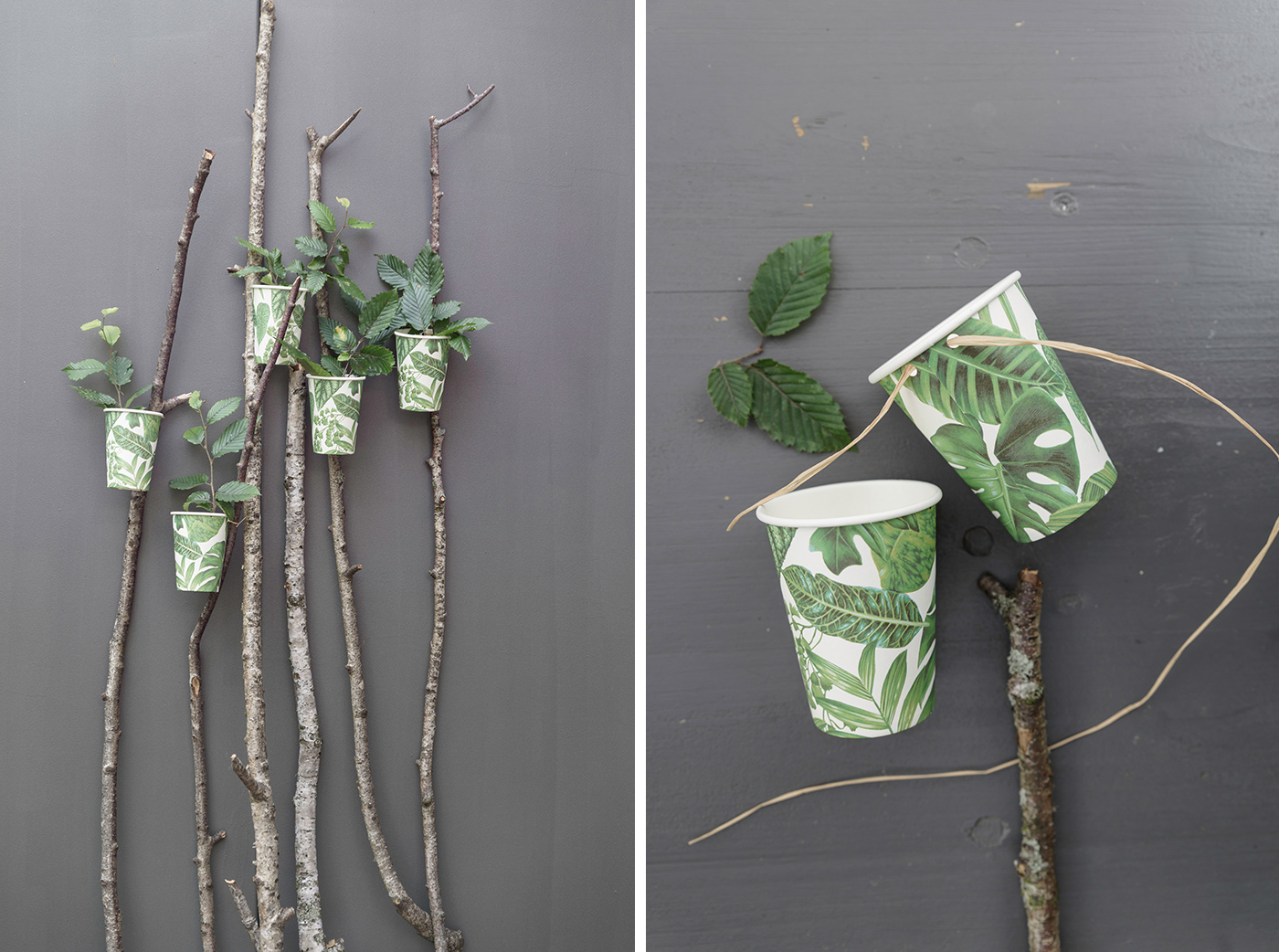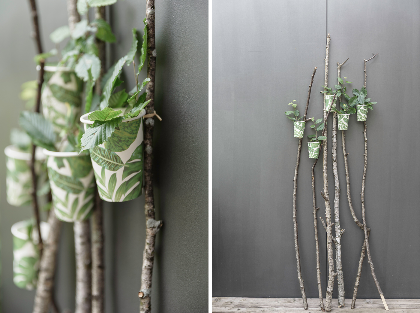 Weiter geht es mit Ästen und Zweigen. Hier habe ich an langen Birkenästen, Pappbecher von DEPOT geknotet. Sie dienen als Spaliervasen und verschönern so manchen Outdoorbereich. Man könnte die Becher auch als Windlicht verwenden.