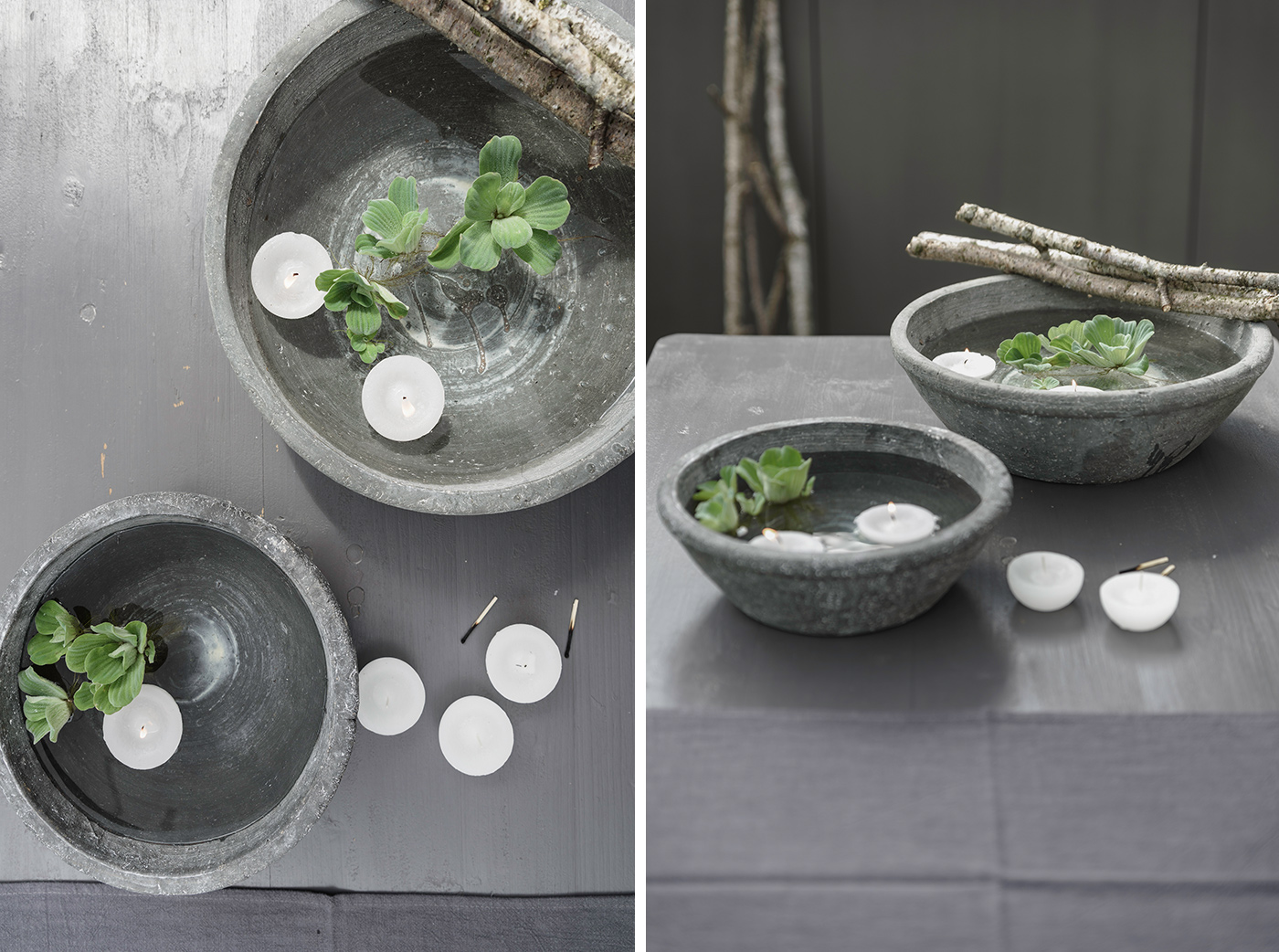 Für meine „Tischteiche“ habe ich zwei unterschiedlich große Dekoschalen aus Beton von DEPOT verwendet. Die Schalen werden mit Wasser gefüllt und mit Schwimmkerzen und Wasserpflanzen dekoriert. Zweige und Äste, die auf den Schalenrand gelegt werden, sorgen für Natürlichkeit. In meinem „Biotop“ schwimmt übrigens Wassersalat, der regelmäßig kleine Ableger bekommt.