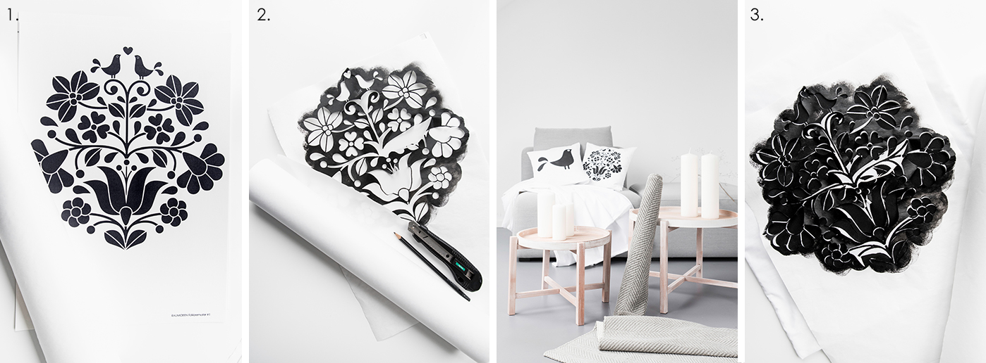 1. Sucht Euch ein passendes Folkloremuster (Beachte die Größe des Kissenbezugs), druckt es aus und übertragt es mit Pauspapier und Kugelschreiber auf die Vorderseite des Freezerpapiers.