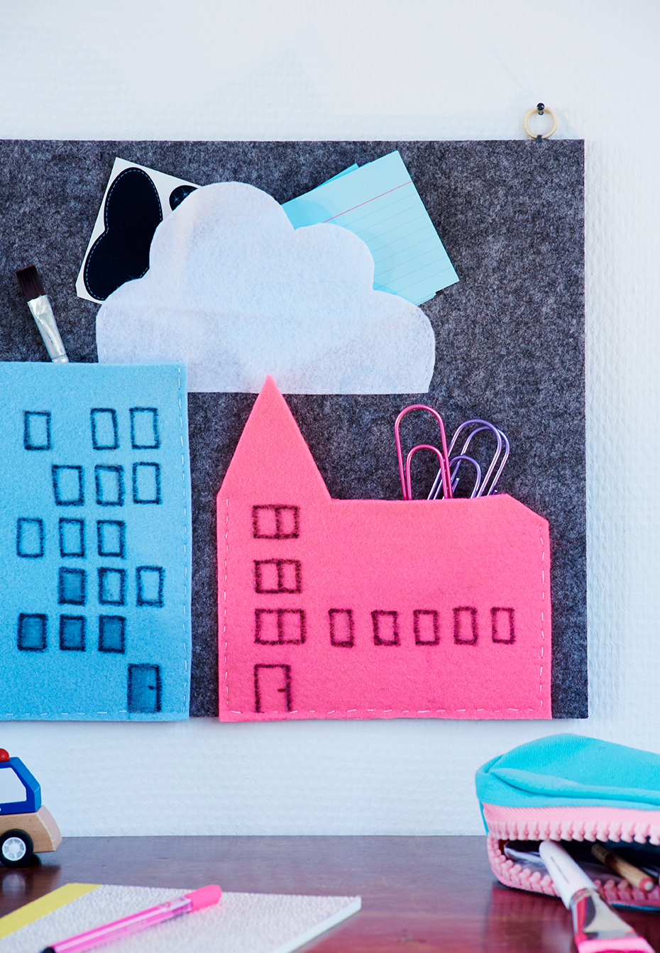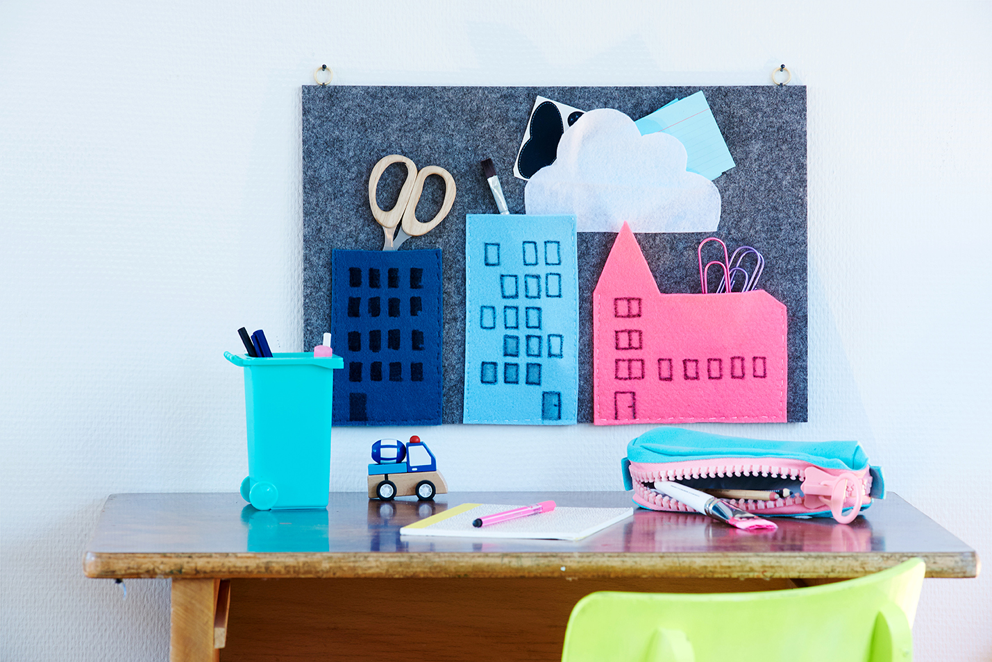Übrigens, das Utensilo ist eine tolle Bastelidee für ein verregnetes Wochenende zusammen mit den Kids. Die Hausformen sind so simpel, das sie beim aufmalen und ausschneiden tatkräfig mit anpacken können. Achte darauf, dünnes Bastelfilz zu besorgen, dann braucht es weniger Kraft beim schneiden.