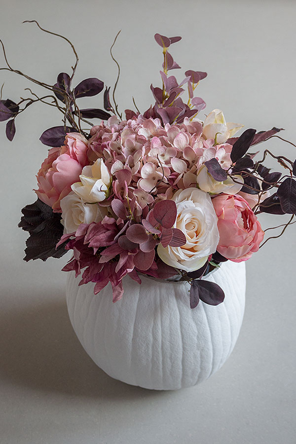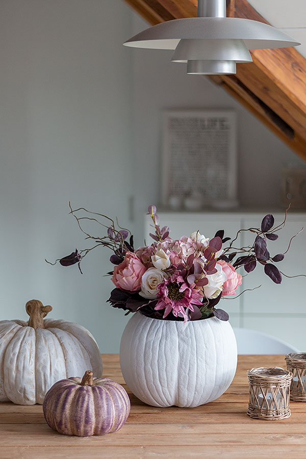 Total begeistert bin ich von den Kunstblumen, die allesamt bei DEPOT erhältlich sind! Diese wirken so echt, dass sie frischen Blumen in nichts nachstehen. Als Farbkombination habe ich Rosé-, Creme- und Beerentöne verwendet. Die harmonieren perfekt miteinander und passen hervorragend in den Frühherbst.