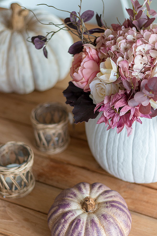 Die Kürbisvase strahlt auf meinem Esszimmertisch mit dem weißen Dekokürbis sowie dem lilafarbenem Dekokürbis um die Wette. Windlichter zaubern Gemütlichkeit in diese herbstliche Tischdeko. Viel mehr braucht es nicht, um das eigene oder auch das Herz der Gäste zu erfreuen. Die Kürbisvase bietet sich auch toll als Geschenkidee an. Darüber hinaus würde sie auch im Eingangsbereich eine gute Figur machen oder was meint ihr?