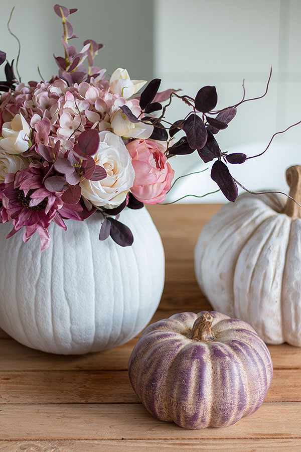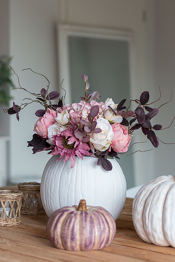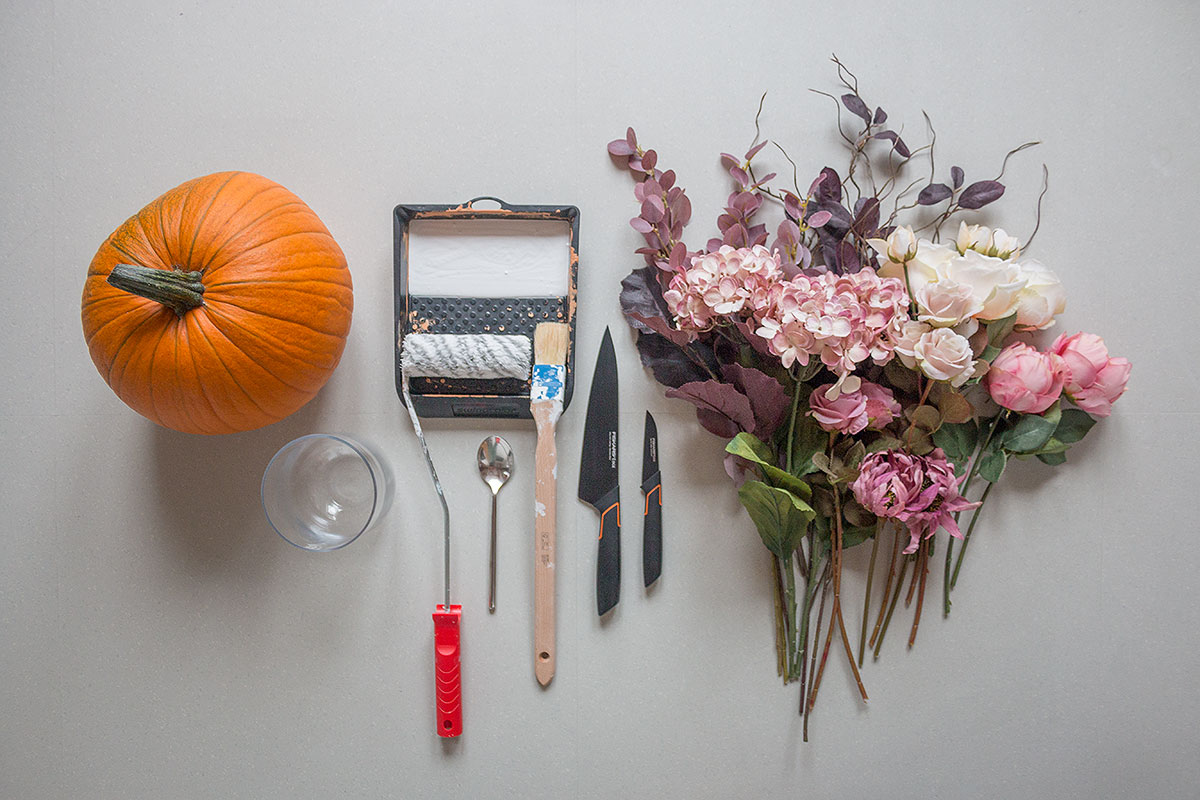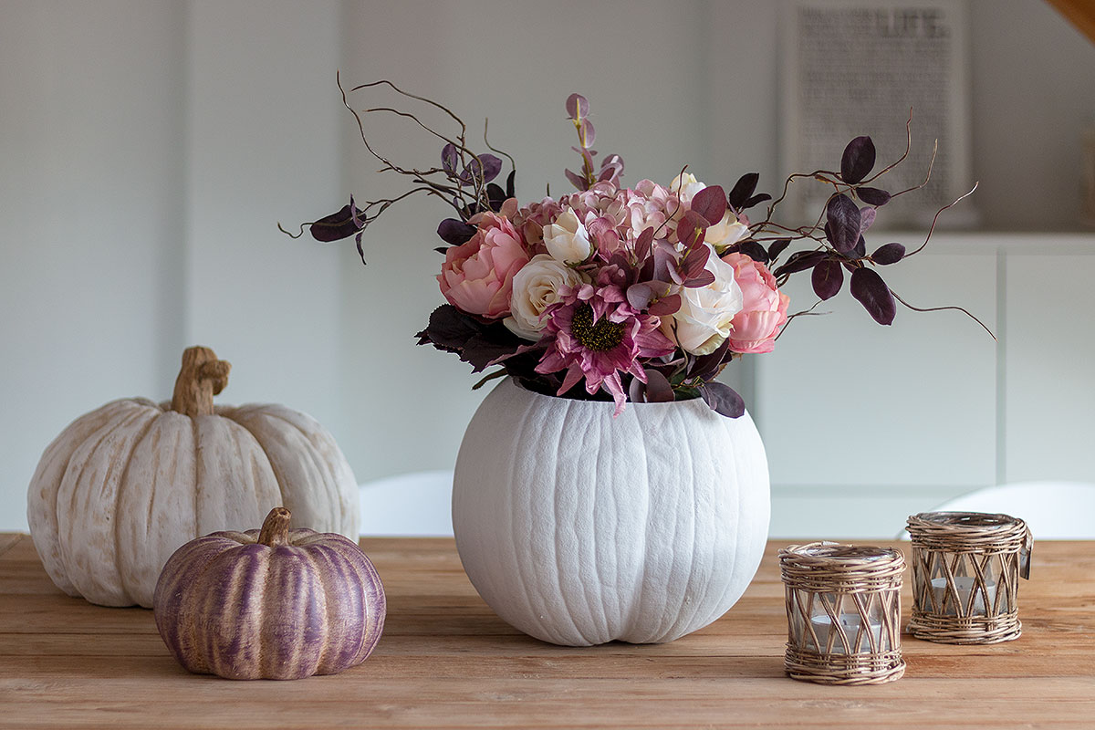 Beim Bauern meines Vertrauens habe ich nach einem Halloween Kürbis gefragt. Toll eignen sich z.B. die Sorten „Ghost Rider“ oder „Jack O’Lantern“. Ihr könnt aber auch jeglichen anderen Kürbis verwenden. Allerdings sollte dieser ungefähr einen Durchmesser von 25 cm haben. Dann nur noch aushöhlen, trocknen lassen und mit Kreidefarbe anstreichen. Wichtig ist die Trockenzeit vor Bestücken der Kunstblumen, da der Kürbis ansonsten schnell von innen anfängt zu schimmeln. 1 – 2 Tage sind dafür nötig. Ihr könnt den Innenraum auch mit Haarspray einsprühen. Das verlängert die Haltbarkeit ebenfalls. Für die äußere Fläche habe mich für Kreidefarbe entschieden, da ich noch einen Rest im Keller stehen hatte und so die Kürbisvase perfekt zu meiner Wandfarbe passt. Genauso gut könnt ihr aber auch Acryllack verwenden und den Kürbis damit besprühen.