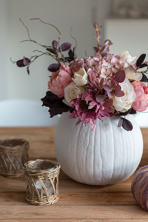 - Die Windlicht Vase in den Kürbis setzen und nach Belieben mit Kunstblumen (Anleitung siehe unten) oder auch echten Blumen bestücken.