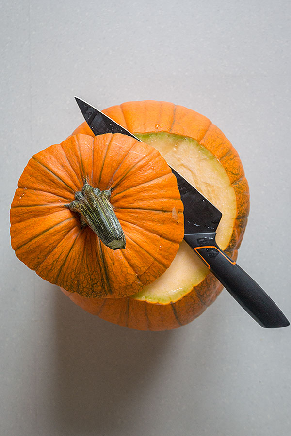 - Den Kürbis gründlich von außen abwaschen und gut abtrocknen. Den Deckel mit einem scharfen großen Messer oben gerade abschneiden.