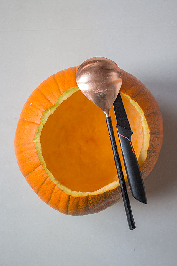 - Mithilfe eines Löffels (es funktioniert auch gut mit einem Eisportionierer) sowie eines kleinen Messers den Kürbis aushöhlen, also das komplette Fruchtfleisch sowie die Kerne entfernen. Es sollte nur noch die äußere Hülle stehen bleiben. Die Innenseiten mit Küchenpapier gut abtrocknen und den Kürbis kopfüber mindestens 24 Stunden trocknen lassen.