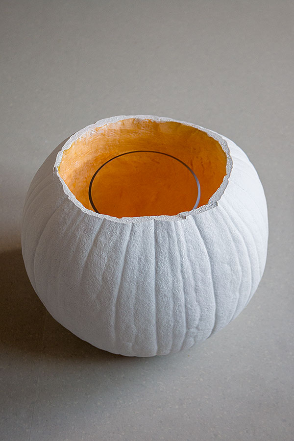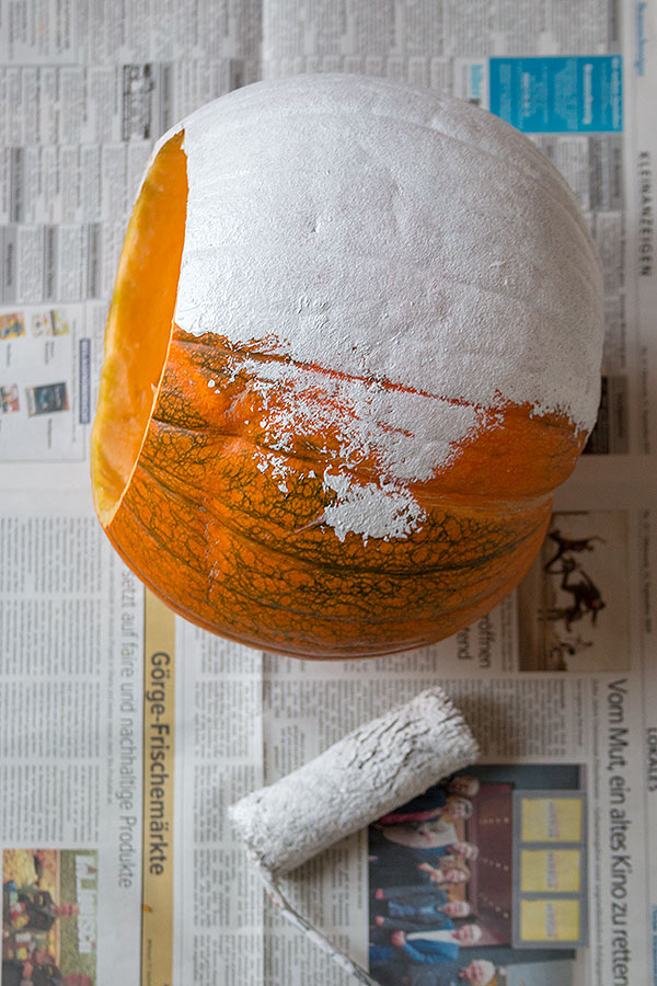 - Zeitungspapier unterlegen und den Kürbis erst von einer Seite mit Kreidefarbe anstreichen, trocknen lassen und dann von der anderen Seite anstreichen. Ebenfalls trocknen lassen. Nach Bedarf mit einem 2. Anstrich versehen. Am besten funktioniert das Anstreichen mit einer kleinen Farbrolle. Alternativ könnt ihr den Kürbis auch mit Acryllack besprühen.