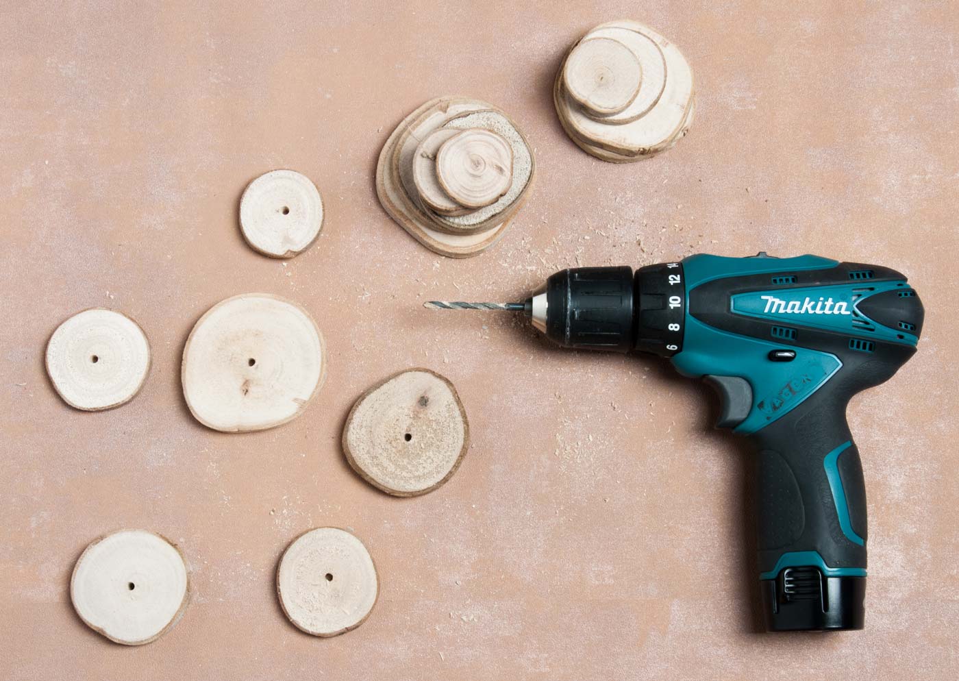 1. Zuerst bohrt ihr ein Loch ziemlich mittig in die Astscheiben.