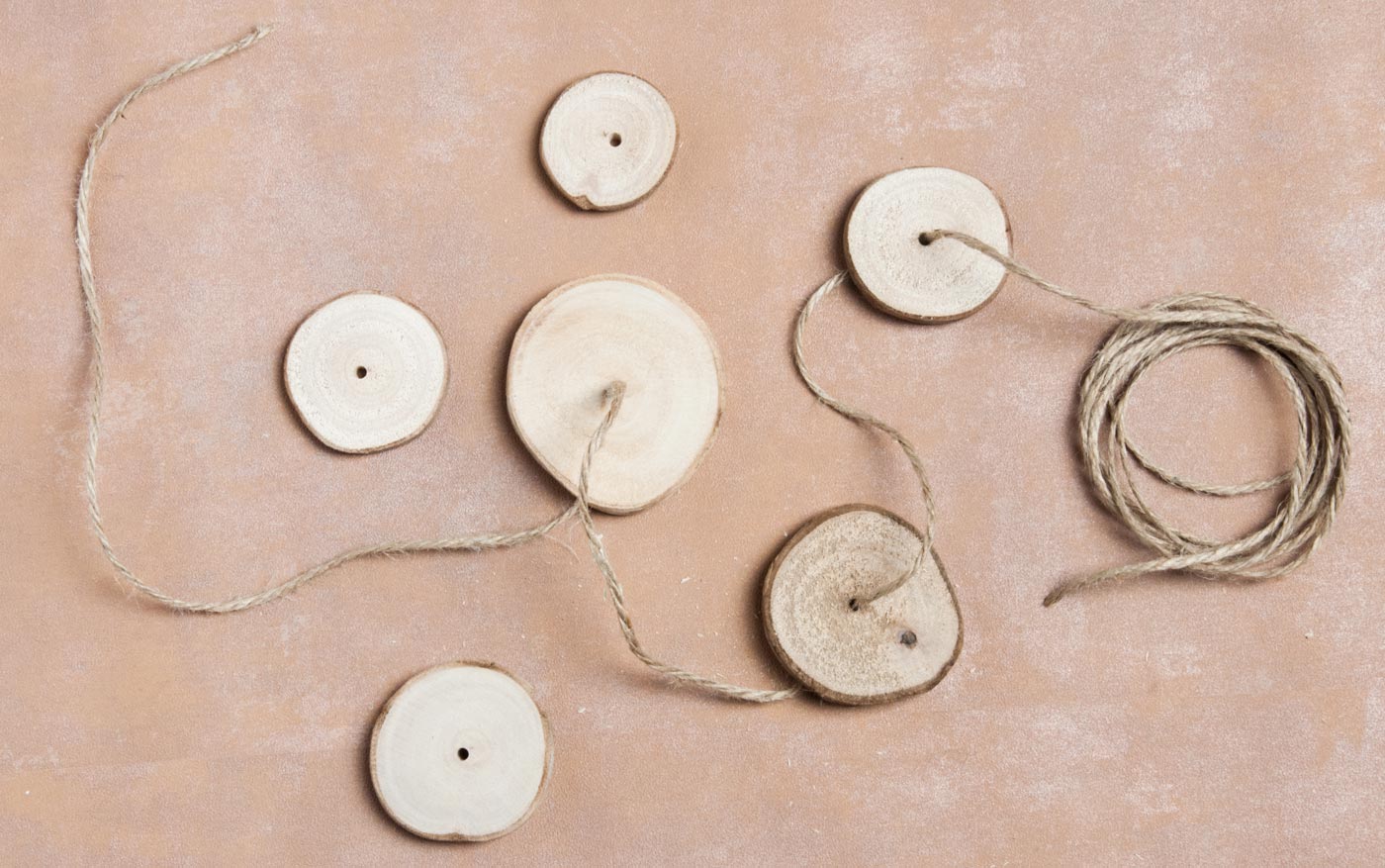 2. Anschließend schneidet ihr ein Stück von der Kordel ab – je nachdem wie lang eure Girlande werden soll. Die Kordel muss jetzt durch eine Astscheiben gefädelt werden. Die Anzahl der Scheiben könnt ihr dabei frei wählen.