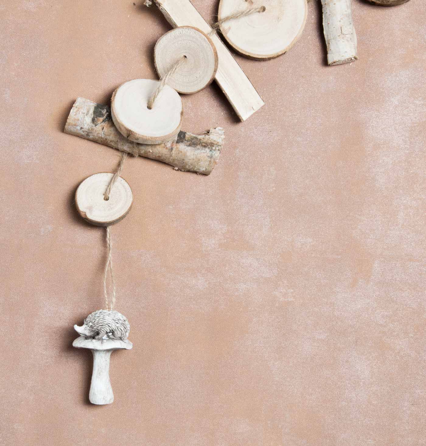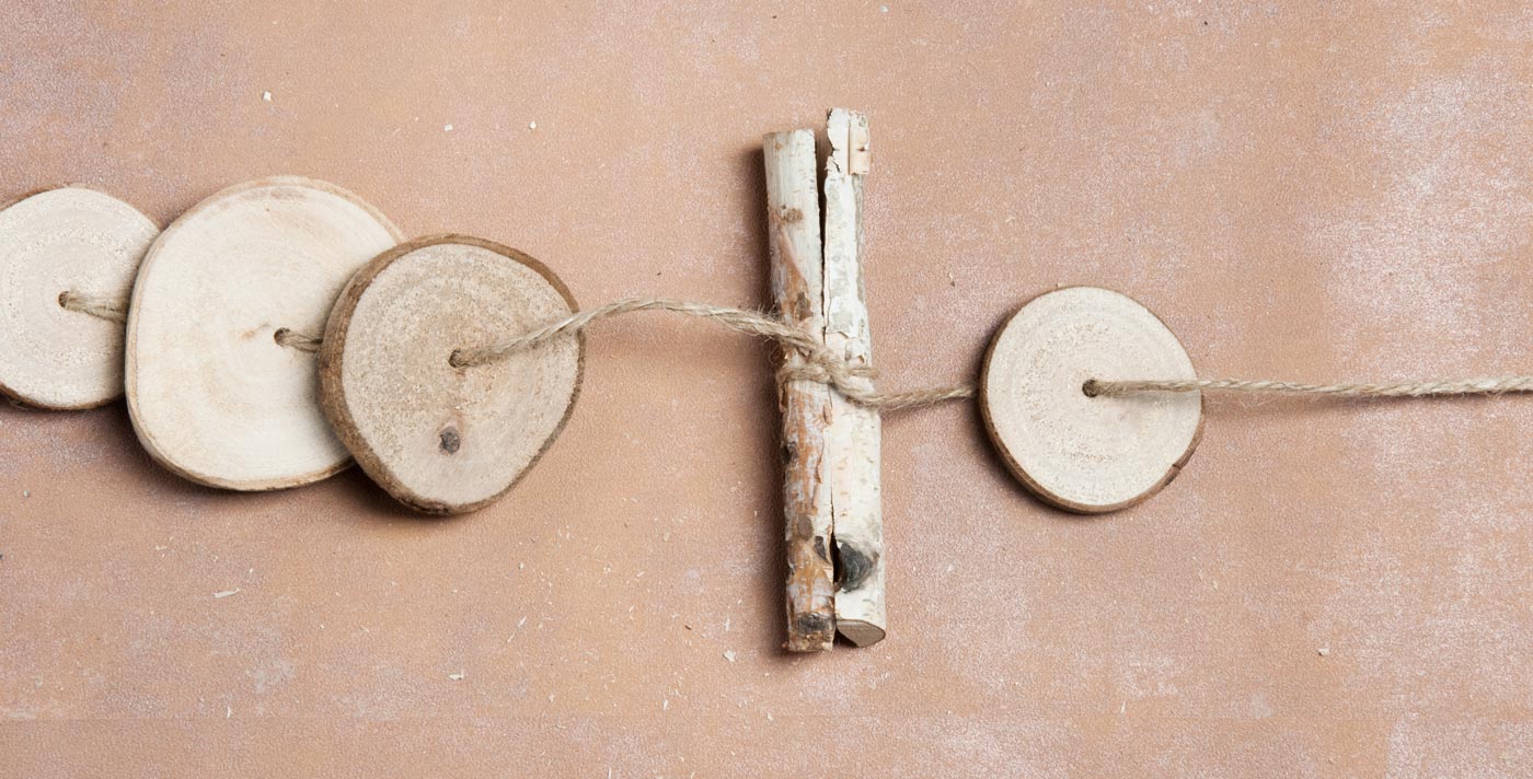 3. Zwischen den Astscheiben werden nun ein bis zwei Birkenstücke an der Kordel befestigt. Dazu legt ihr die Birkenstücke auf die Kordel und verknotet die Enden miteinander. Da die Astscheiben auf die Birkenstücke fallen werden, wenn die Girlande hängt, welchselt ihr nun zwischen Astscheiben und Birkenstücken ab.