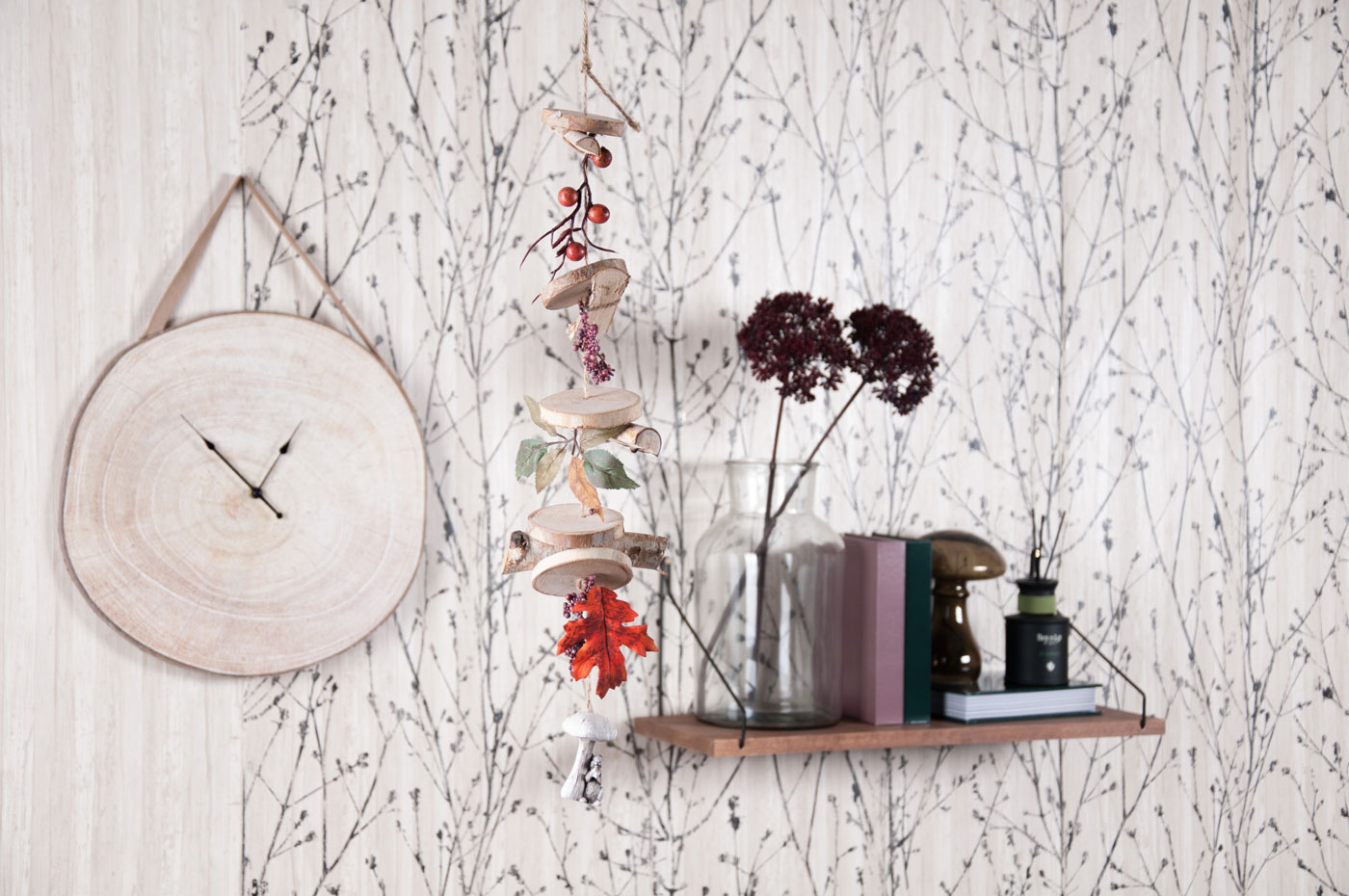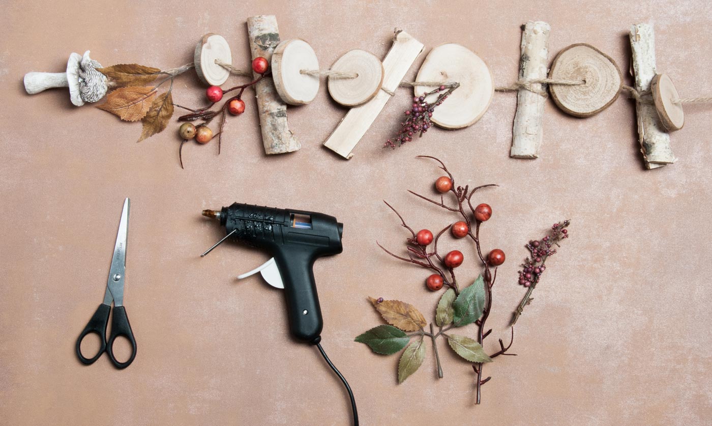 5. Nun sind die Zweige und Beeren an der Reihe. Diese fixiert ihr an der Girlande mit Hilfe der Heißklebepistole. Lasst die Girlande mindestens 5-10 Minuten liegen, damit der Kleber trocknen kann. Fertig ist die Herbstgirlande und bereit zur Dekoration in eurer Wohnung.