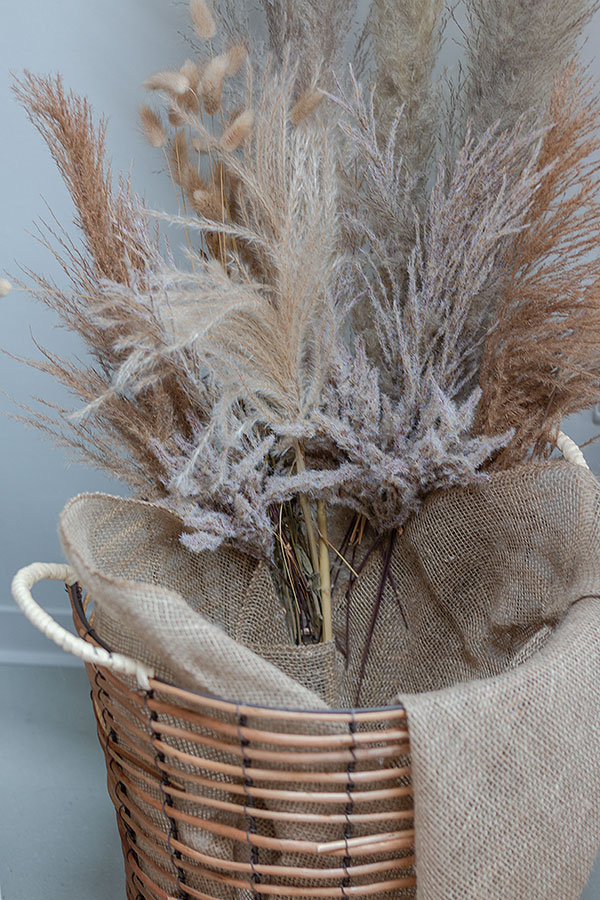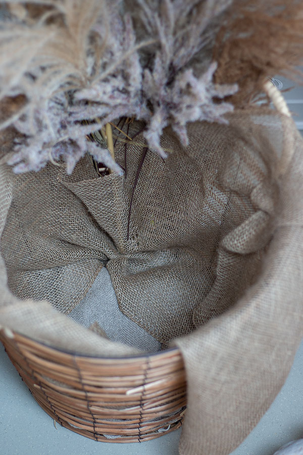 3. Trockengräser in verschiedenen Höhen an einer Seite des Korbes zwischen Dekostoff und Korb stecken.