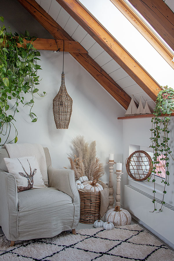 Nicht nur hübsch anzusehen, sondern auch magisches Licht zaubert diese Hängeleuchte aus Rattan. Die ungewöhnliche Form macht sie zu unweigerlich zu einem tollen Hingucker. Perfekt für meine Leseecke! Dort werde ich wohl bald wieder öfter sitzen und die Herbststimmung in unserem Hinterhofgarten durch die Fenster genießen. Mit an Bord natürlich eine kuschelige Decke und das Kissen mit der süßen Antilope.