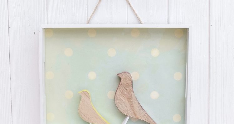 Kleiner Tipp: Mit wenigen Handgriffen lässt sich diese Wanddekoration im Nu verändern. Hier habe ich anstelle der zwei Dekovögel aus Holz einen Ast am Rand des Tabletts mit einem kleinen Reißnagel befestigt und mit zwei Porzellanvögeln geschmückt. Eine weitere Möglichkeit wäre, Kunstblumen mit einzubauen. Ihr seht, euren kreativen Ideen sind hierbei keinerlei Grenzen gesetzt.