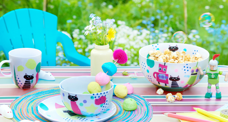 Doch nicht nur Snacks machen eine gute Figur in den Schalen und Tassen. Diese Woche haben wir einen Malnachmittag eingelegt. Der Himmel war blau, die Bäume endlich grün und wir haben es uns im Schatten gemütlich gemacht und die Buntstifte gezückt. Auch wenn sich die Sonne wieder verzogen hat- das Geschirr bleibt und ein hoffentlich langer Sommer liegt noch vor uns. Ich freue mich schon auf kreative Sommertage!