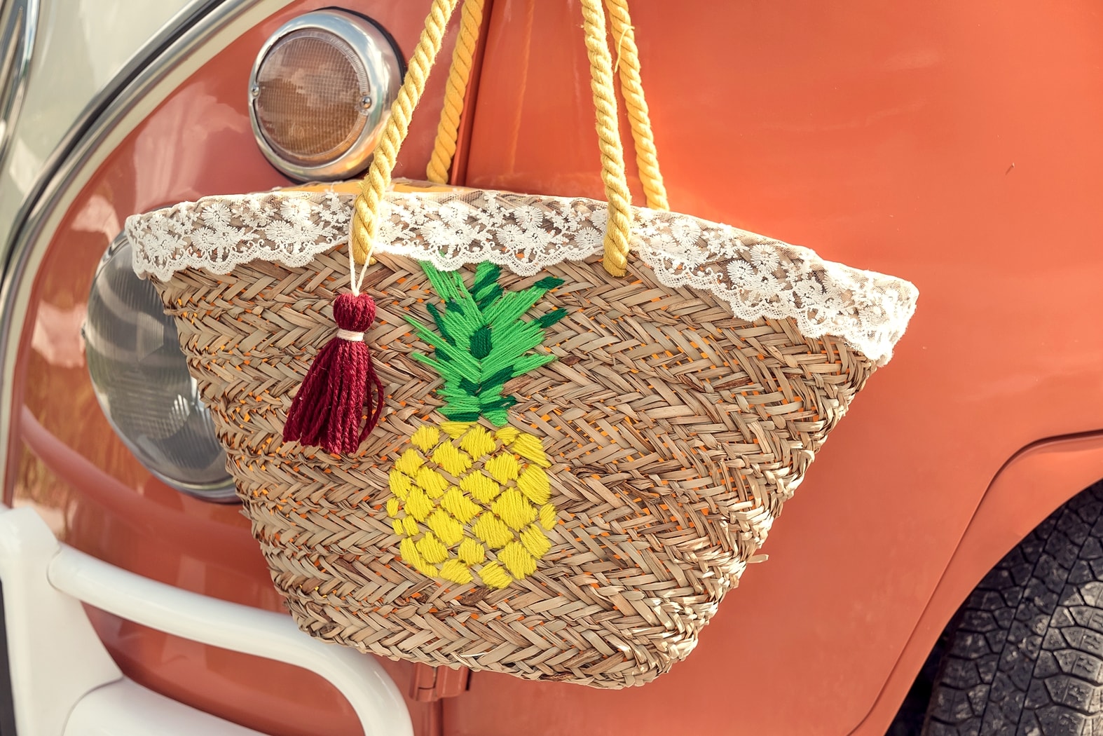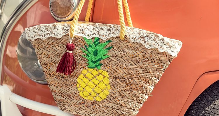 Die Korbtasche mit dem leuchtend gelben Ananas-Motiv wirkt so richtig sommerlich frisch. Da möchte man am liebsten gleich seine Badesachen hineinpacken und ans Meer oder an den See fahren. Um der Tasche einen individuellen Look zu verleihen, habe ich sie mit einem Spitzenband und einer Quaste aufgehübscht.