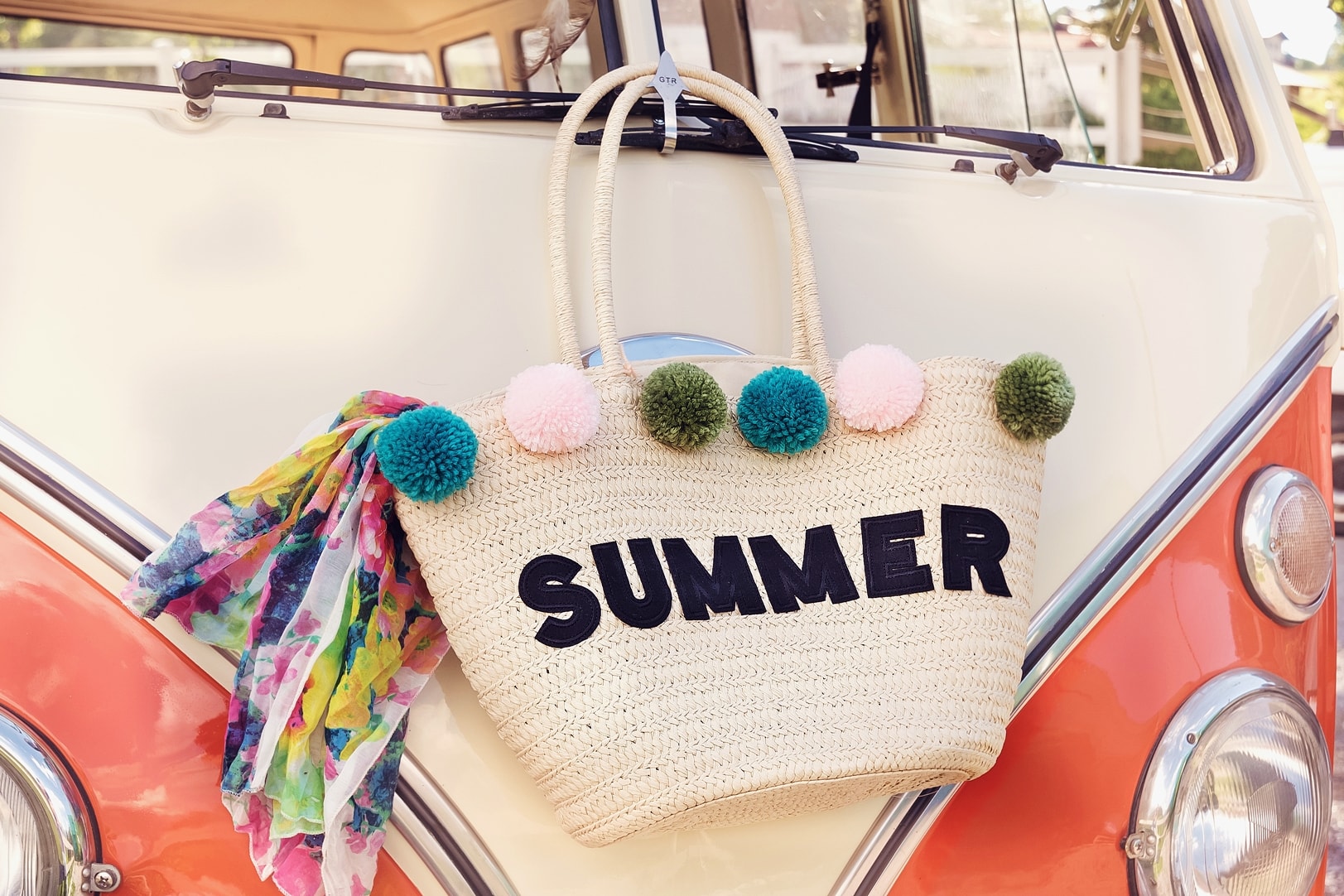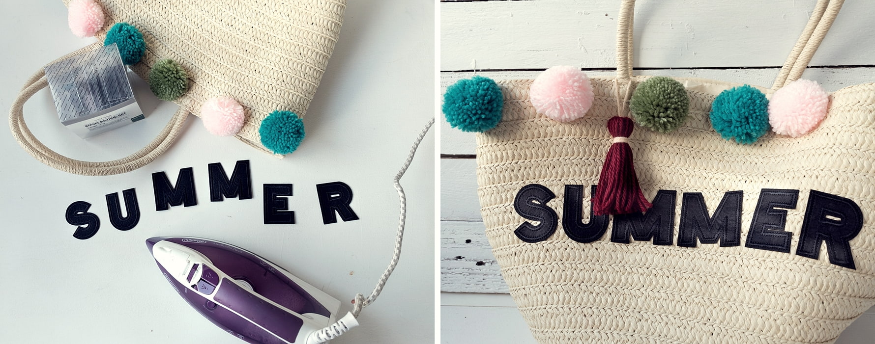 Fröhlich bunte Bommel zieren diese sommerliche Basttasche. Viel mehr Deko benötigt es da nicht. Lediglich ein paar aufbügelbare Buchstaben sowie eine selbstgemachte Quaste verleihen der Korbtasche zusätzlichen Pfiff.
