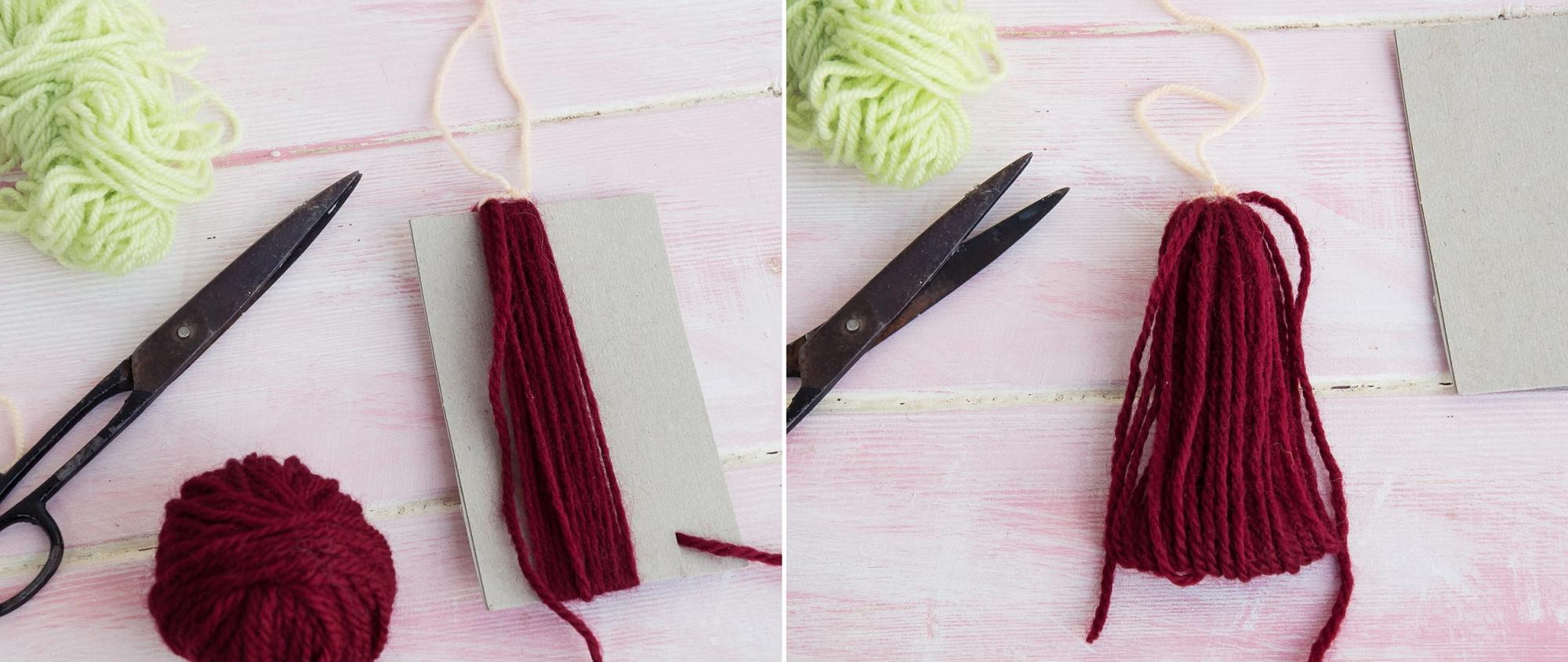 - Den Wollfaden entsprechend der gewünschten Breite der Quaste um den Karton wickeln.