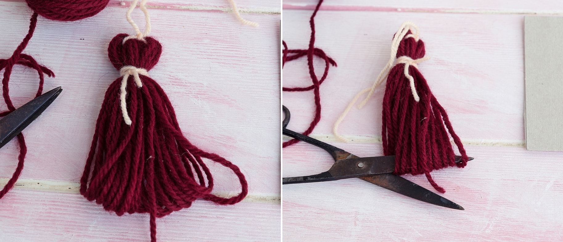 - Mit der Schere die Quaste genau in der Mitte auseinanderschneiden.