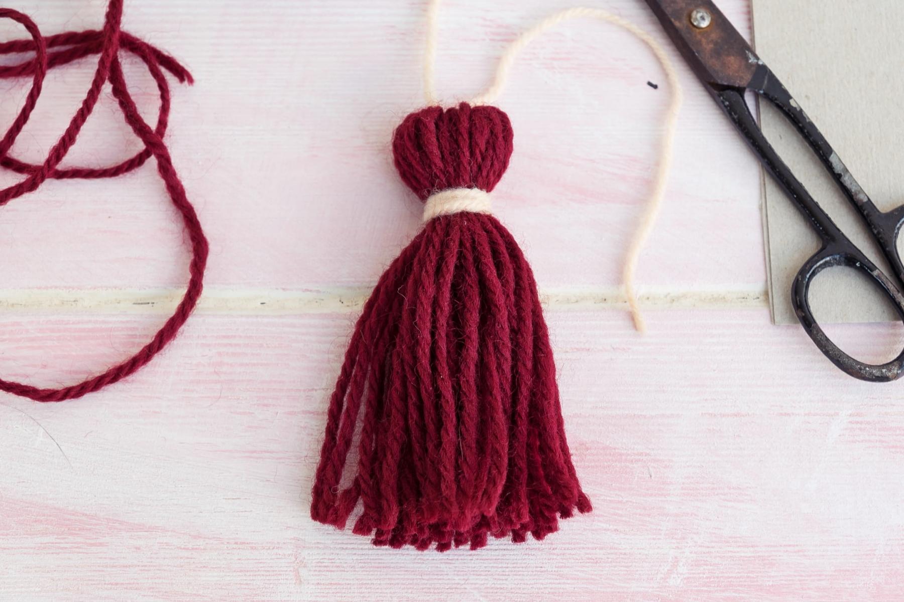 - Mit einem weiteren Wollfaden den oberen Teil der Quaste abbinden und fest verknoten.
