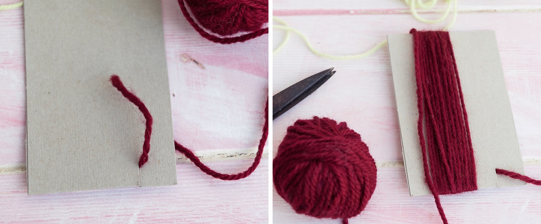 - Karton (12 cm x 8 cm) zuschneiden. Mit der Schere einen Einschnitt zum Fixieren der Wolle schneiden.