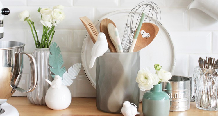 Damit die schönen Küchenaccessoires danach nicht in irgendeiner Schublade verschwinden, habe ich einfach ein großes Windlicht im angesagten Rauchglaslook als Utensilhalter zweckentfremdet. Ein kleiner Aufsetzvogel aus weißem Keramik (in der DEPOT Filiale erhältlich) macht den Frühlingslook in der Küche dann perfekt.