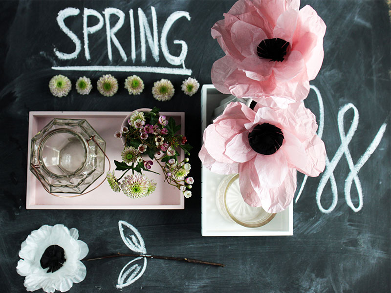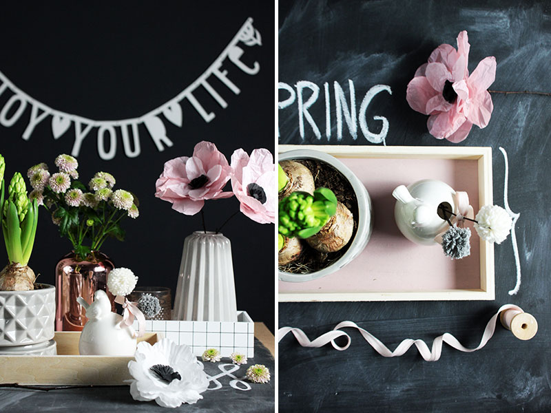 In schönen Vasen z. B. von DEPOT mit ein paar frischen Blumen kombiniert, sind die die DIY Papierblumen ein echter Hingucker. Etwas aufgeräumter wirkt das ganze Ensemble, wenn die verschiedenen Vasen auf kleinen Tabletts angeordnet sind. Man kann hier aber z. B. auch eine kleine Holzbox mit Deckel zweckentfremden, so hat man gleich 2 Tabletts auf einmal. Ebenso schön sind z. B. Zahnputzbecher als kleine Vasen. Versucht es einfach mal!