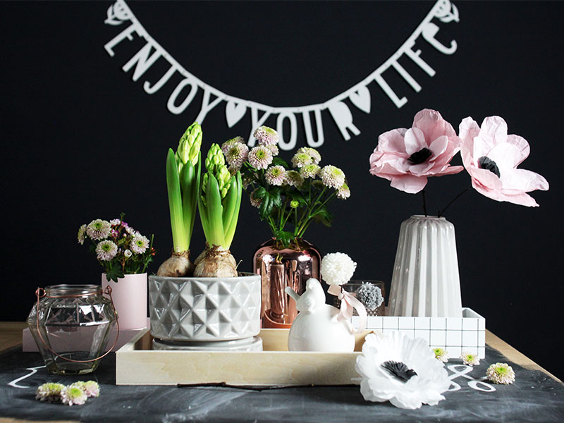 Jetzt liegt er endlich, der lang erwartete Schnee. Doch leider ein paar Woche zu spät, denn trotz der winterlichen Temperaturen, ist mir bereits eher nach Frühlingsdeko zu Mute. Bei der schönen Blumenauswahl, die es jetzt schon beim Blumenhändler gibt, ist das auch kein Wunder – Tulpen, Hyazinthen und kleine Wachsblumen.