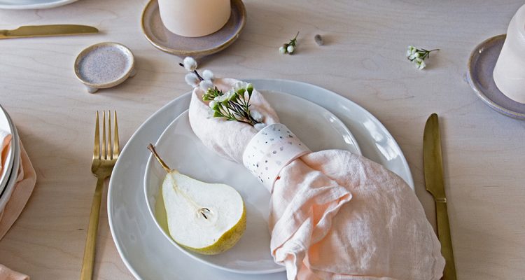 Zu den Must-Haves „Steingutgeschirr“ und „Leinen“ passen die DIY Serviettenringe im zarten Keramik-Look einfach perfekt. Besonders schön und frisch wirkt die gedeckte Tafel mit viel Weiß, Gold, zartem Rosa und einem leichten Touch Aprikot.