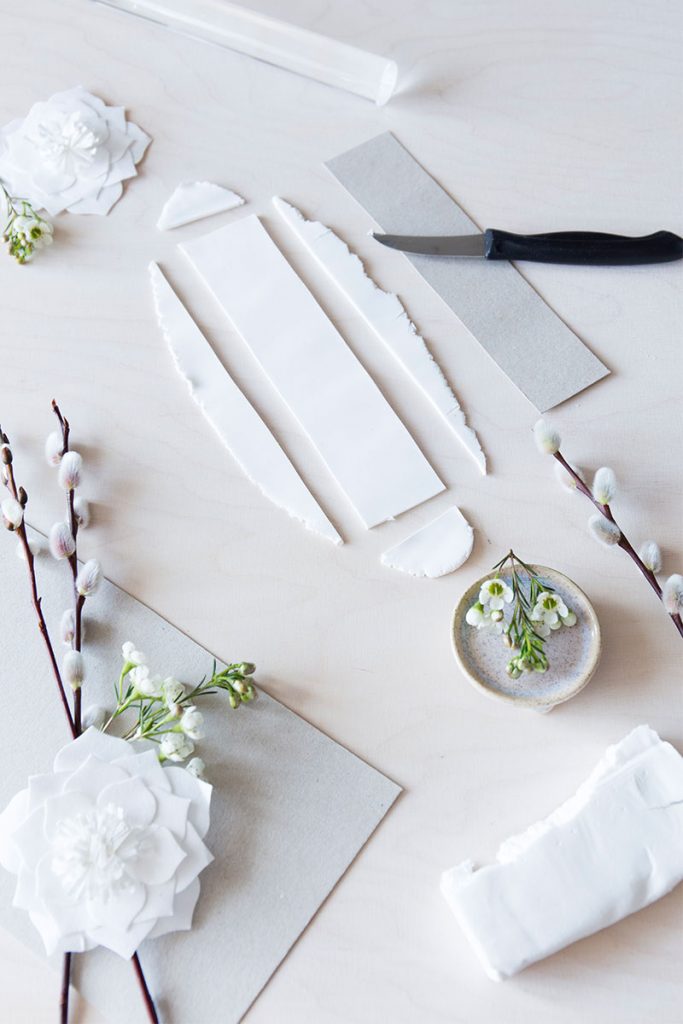 - Aus der Pappe eine Schablone von 5x14cm zuschneiden und auf die ausgerollte Modelliermasse legen. Mit dem Messer um die Schablone drum herum schneiden. Tipp: als Unterlage eine Bastelmatte oder Backpapier verwenden.
