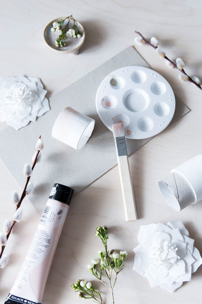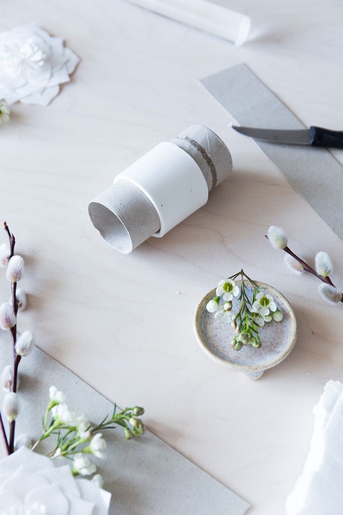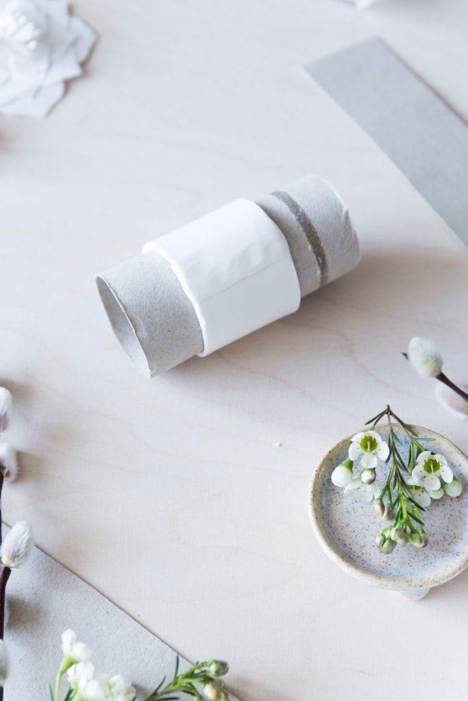 - Das ausgeschnittene lange Rechteck direkt um die Papprolle legen und an den beiden Enden gut zusammendrücken. Trocknen lassen.