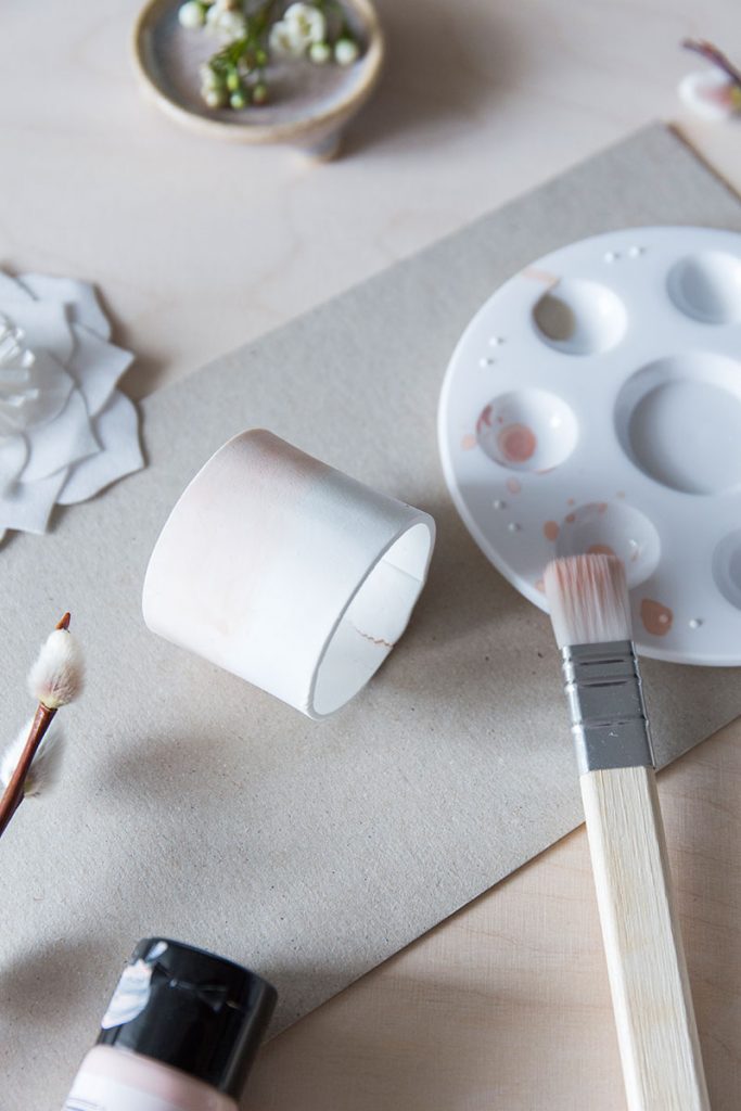 - Den rosa Farbton mit viel Wasser vermengen und mit einem breiten Pinsel in der Hälfte um den Serviettenring auftragen. Wieder trocknen lassen.