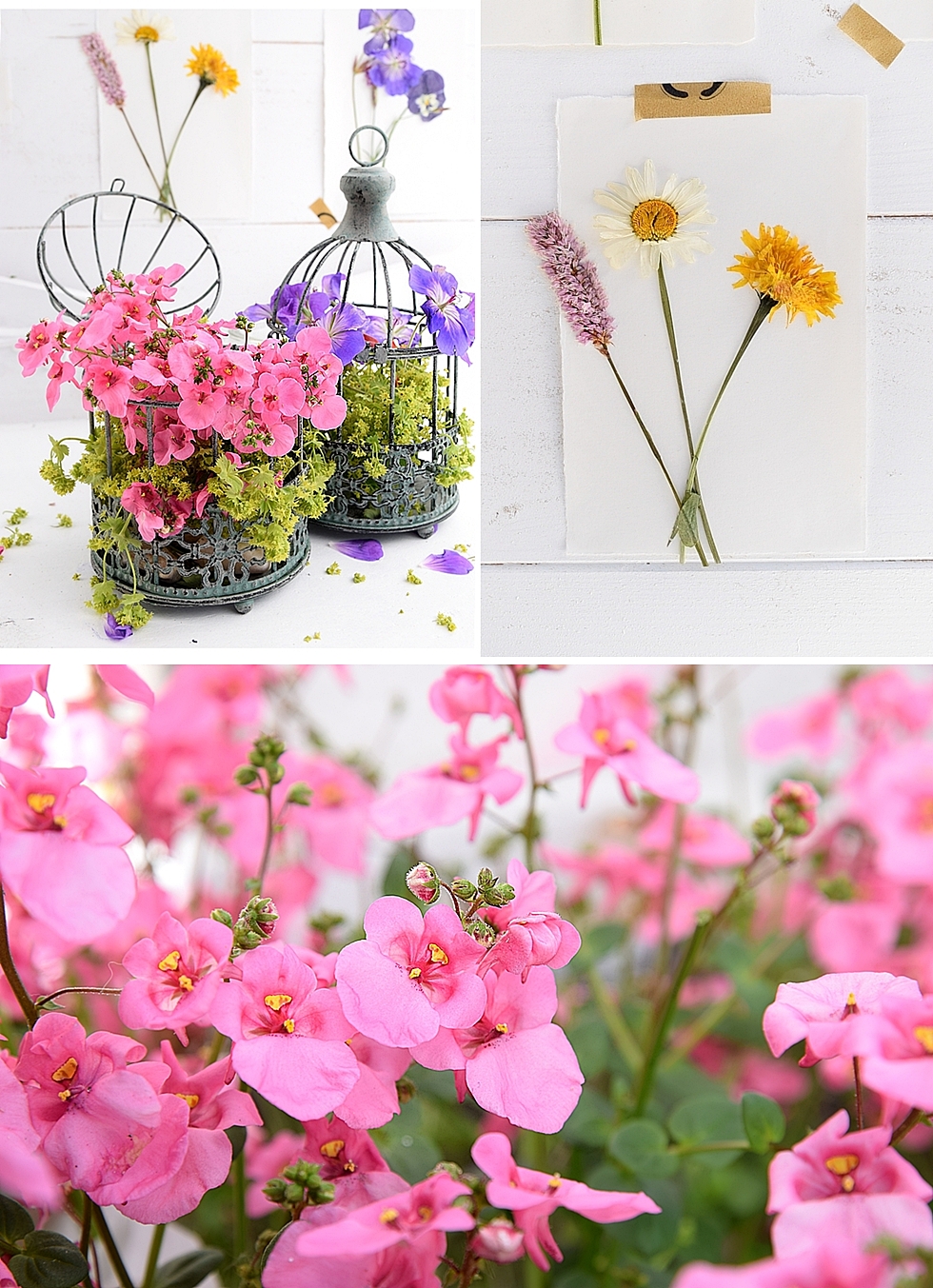 Wie frisch von der Wiese gepflückt, verbreiten die Blumen an der Wand und in den Vogelkäfigen heitere Sommerlaune. Ich liebe solche romantisch, verspielten Dekorationen. Sie bringen den Sommer direkt ins Haus und setzen farbenfrohe Akzente.