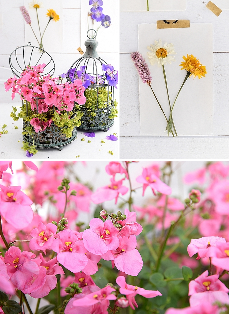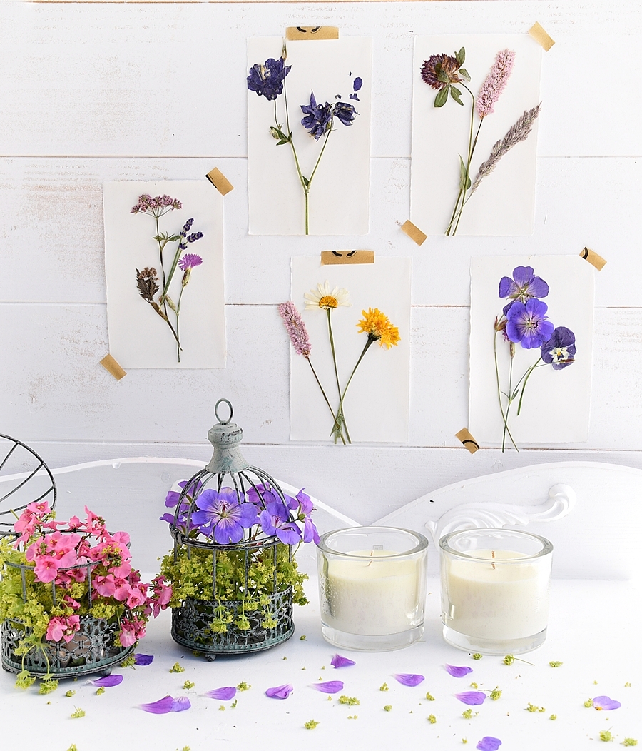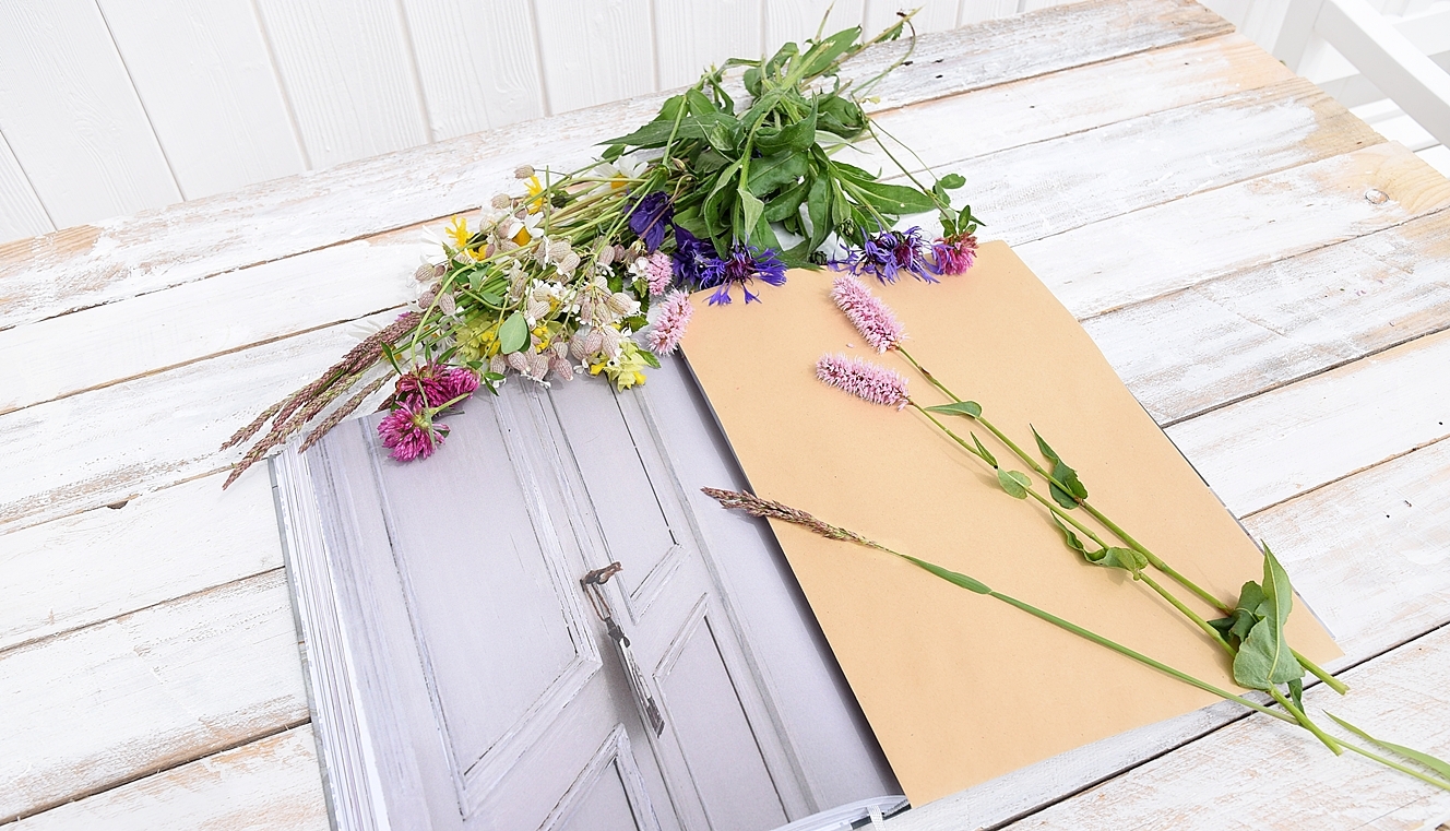 …und natürlich jede Menge Blumen aus eurem Garten oder von der Wiese. Zum Trocknen eignen sich am besten Blüten, die nicht zu wasserhaltig sind. Beim Pflücken der Blumen solltet ihr darauf achten, dass die Blüten trocken und unversehrt sind. Sollten die Pflanzen doch ein wenig feucht sein, einfach mit Küchenpapier trocknen, bevor ihr sie presst.