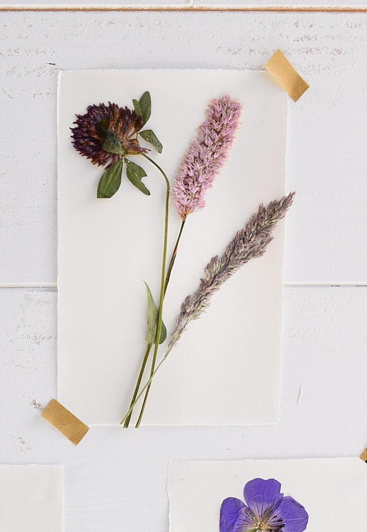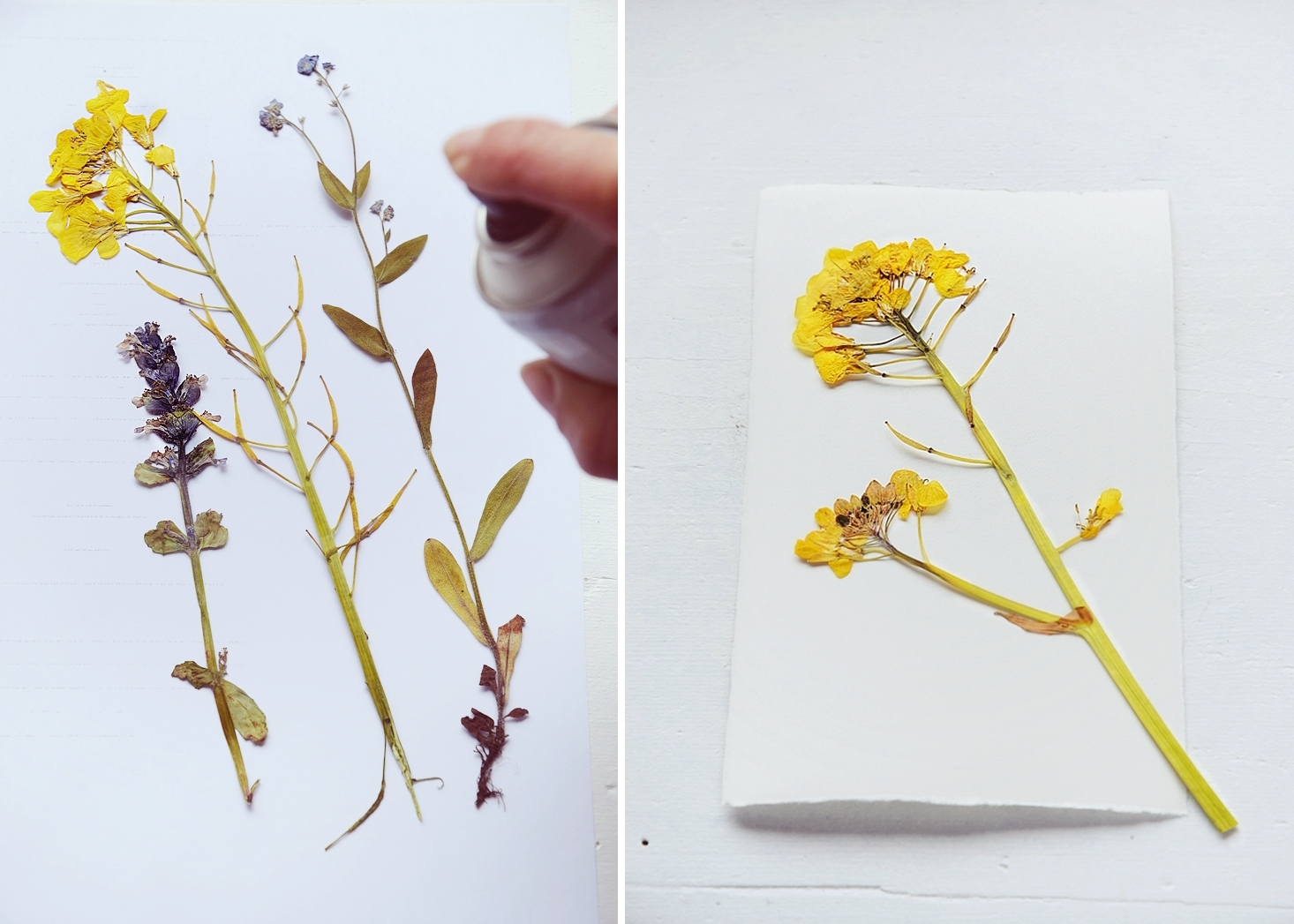 Zum Schutz vor Schmutz und Feuchtigkeit werden die getrockneten Pflanzen mit einem Klarlack versiegelt. Dadurch bleibt die Farbe der Blumen auch besser erhalten und die Blüten werden zudem vor dem Auseinanderbrechen geschützt. Jetzt könnt ihr die gepressten und versiegelten Blumen mit Hilfe eines Sprühklebers auf eure Karten aufkleben. Für meine Karten habe ich handgeschöpftes Papier verwendet, da dieses besonders edel wirkt und die gepressten Schönheiten zauberhaft in Szene setzt.